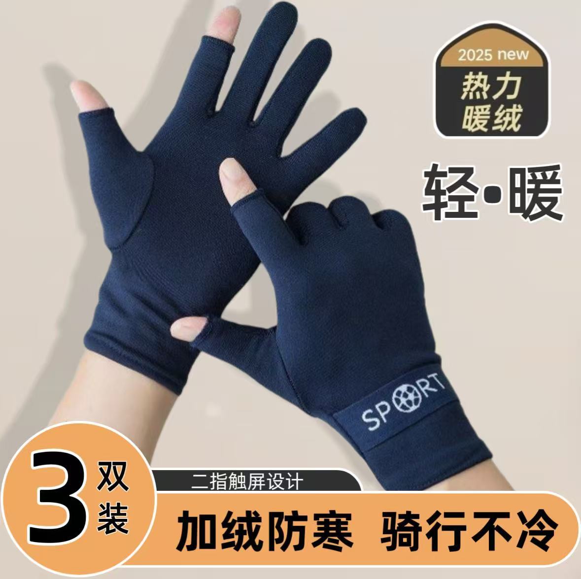 手套男士加绒款保暖高弹露二指可触屏加厚防寒防风电动车开车跑步