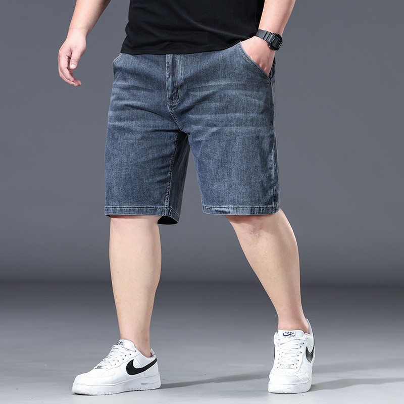 男性は太ってデニムの半ズボンを大きくして、ゆったりしています。
