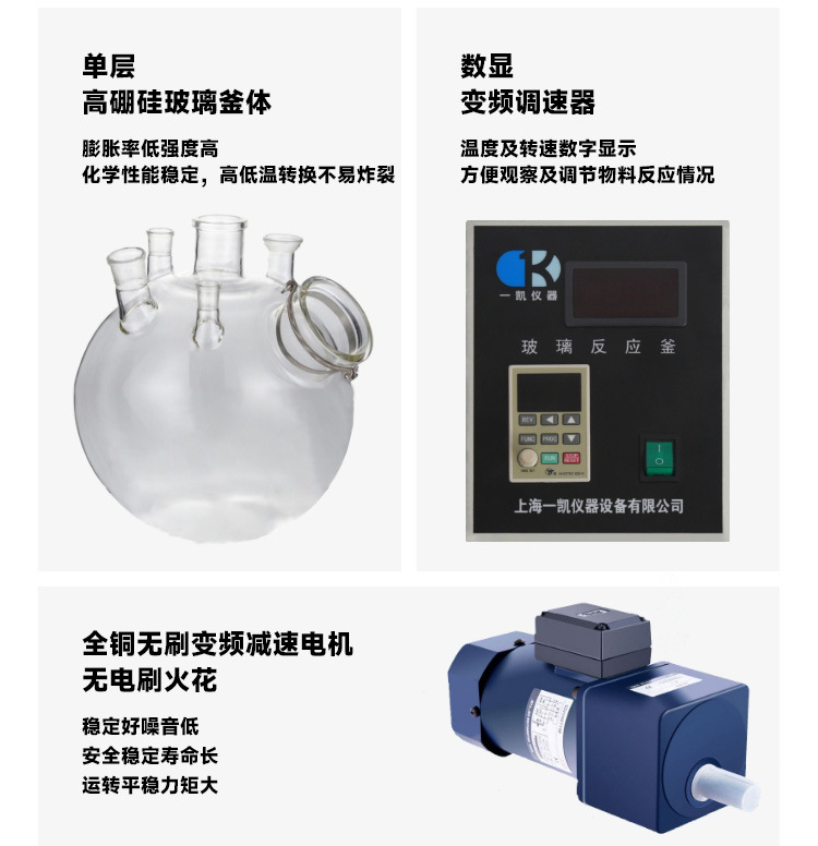 上海一凯は、通常の二重層ガラス反応釜、ジャケット加熱反応釜、実験用ガラス反応釜を供給しています。