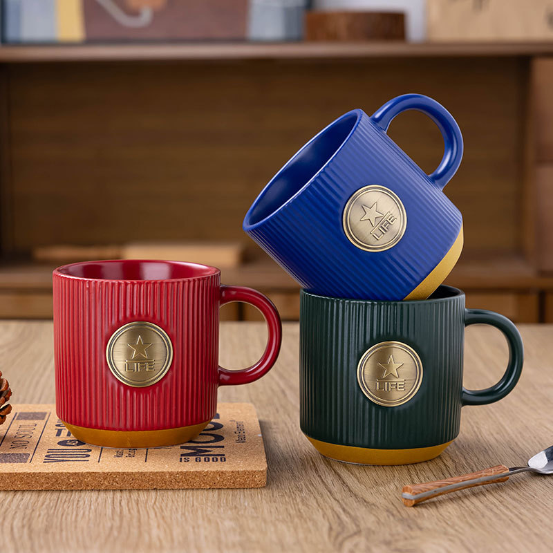 陶磁器カップストライプカップマグカップ描金コーヒーカップ浮き彫り銅メダルカップルカップお土産彫刻ロゴカップ