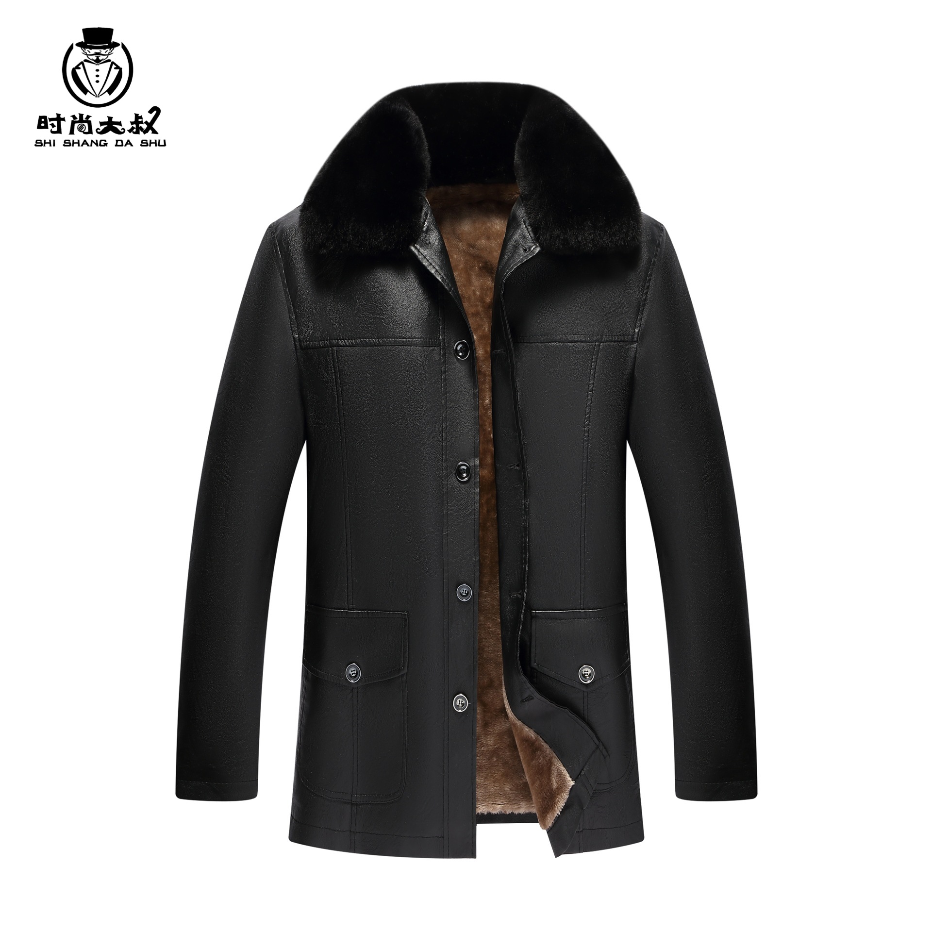 お父さんの大きい毛の襟の皮の服のコートの冬のベルベットは厚くて高級な中高年の男性のジャケットのブランドを厚くします。
