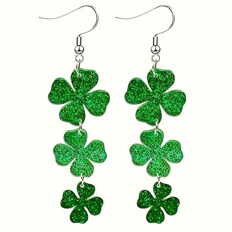 圣帕特里克节耳环百搭绿色亚克力闪粉四叶草幸运草耳饰狂欢节限定