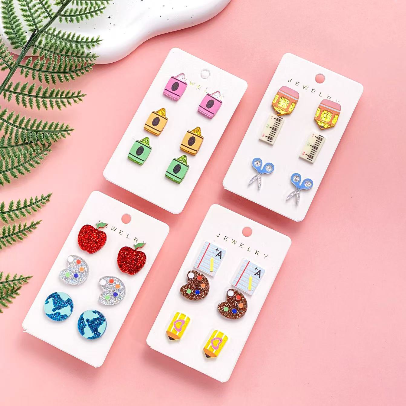 教師の日入学アクリルピアスかわいい鉛筆リンゴ地球画板欧米ピアスセット女性
