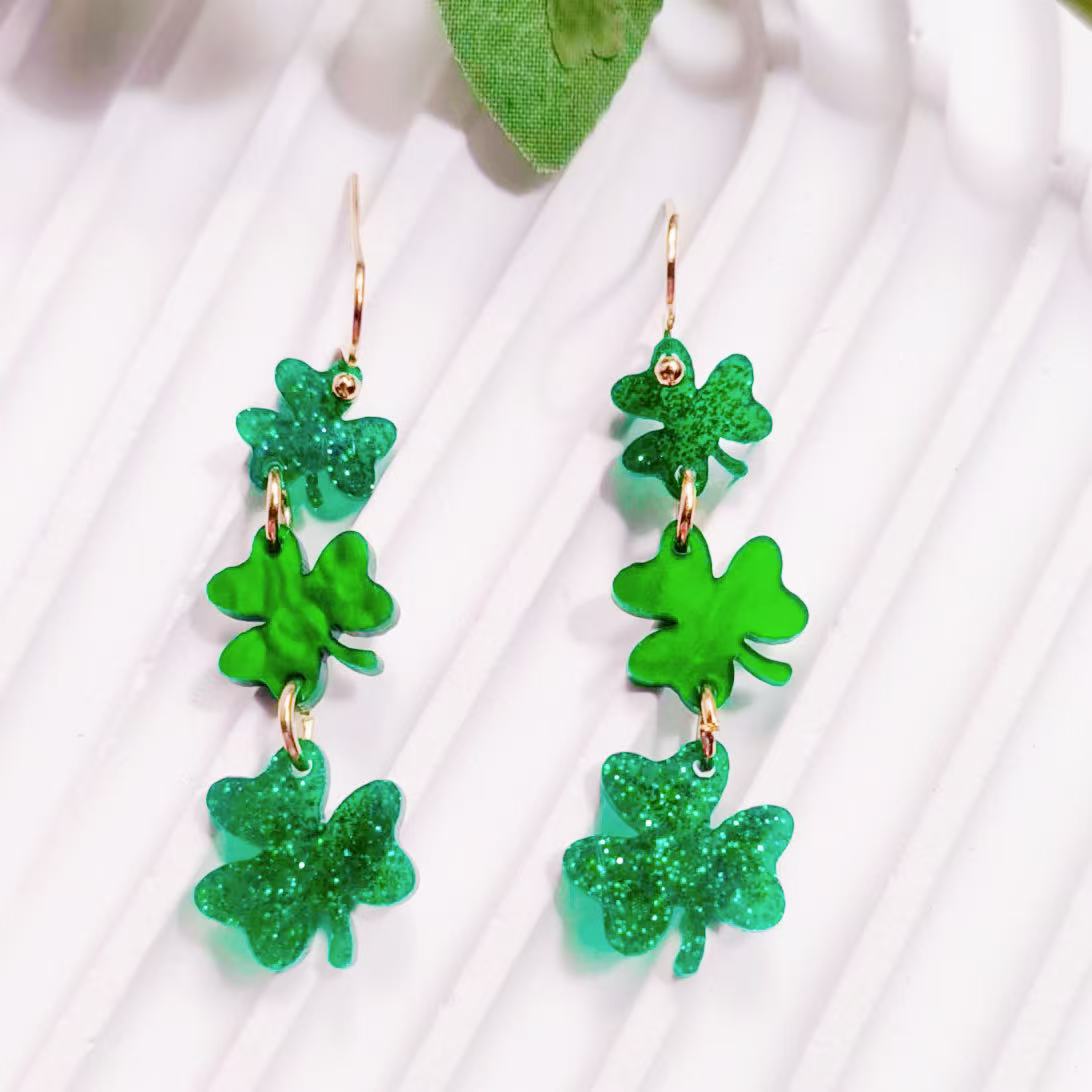 亚马逊跨境欧美节日闪粉圣帕特里克节四叶草三叶草亚克力女士耳坠