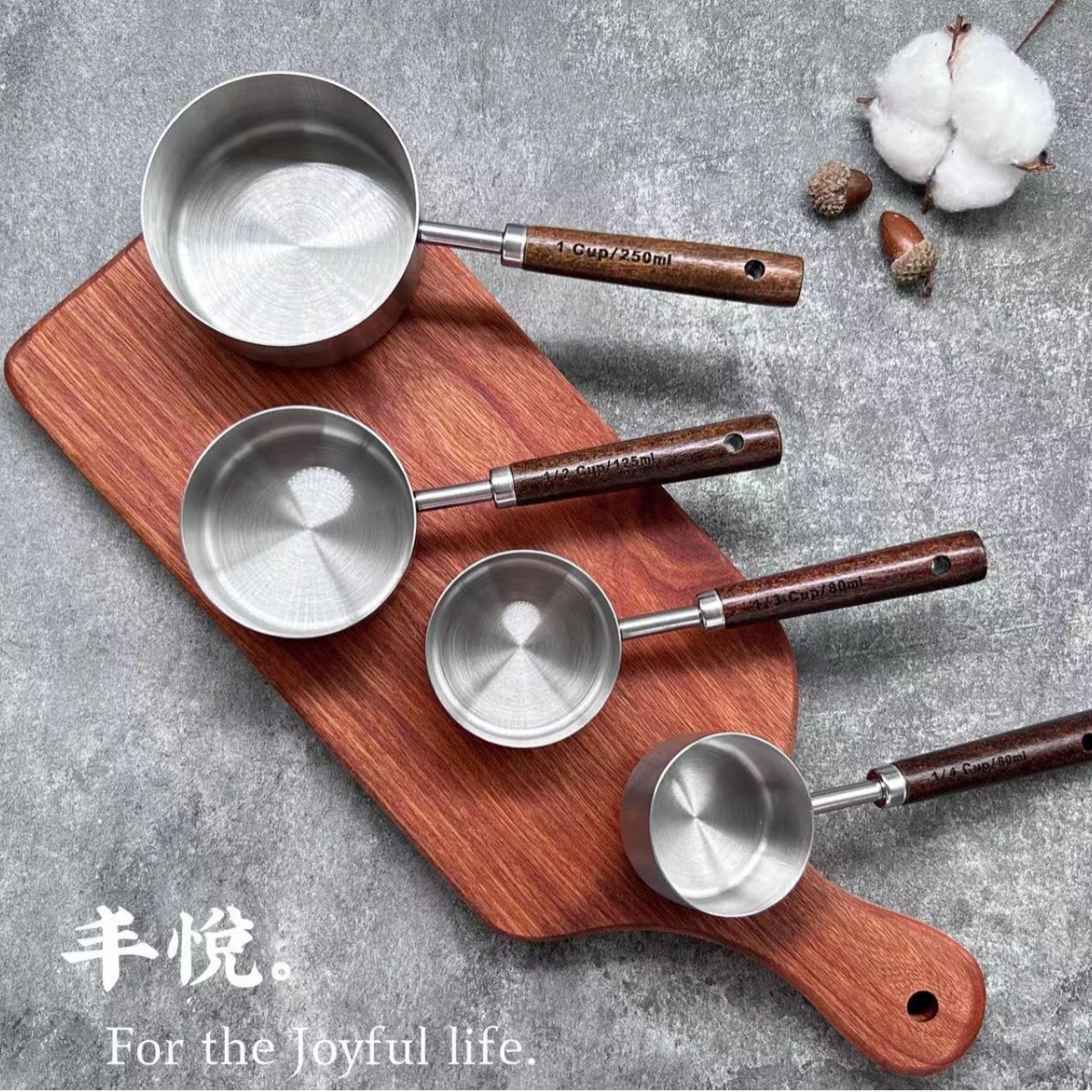 ステンレス鋼のアカシアの木の取っ手の計量カップの4つのセットのコーヒーの計量カップの目盛りの計量カップの焙煎ツールのメーカーの卸売り