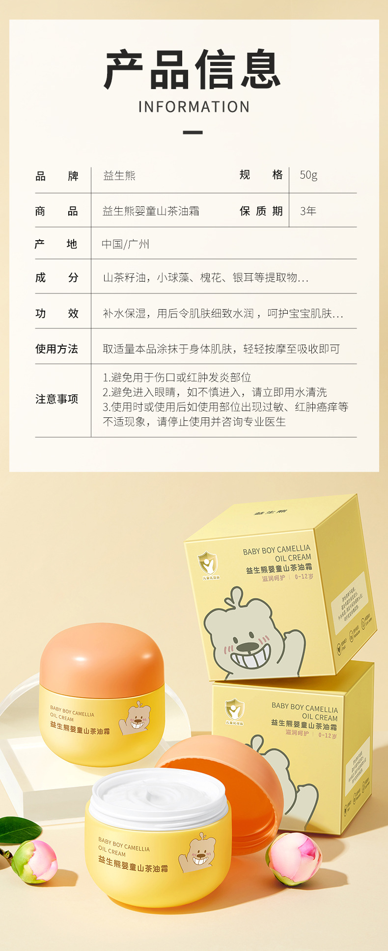 益生熊婴童山茶油霜润护肌肤润保湿四季可用温和亲肤婴童面霜批发