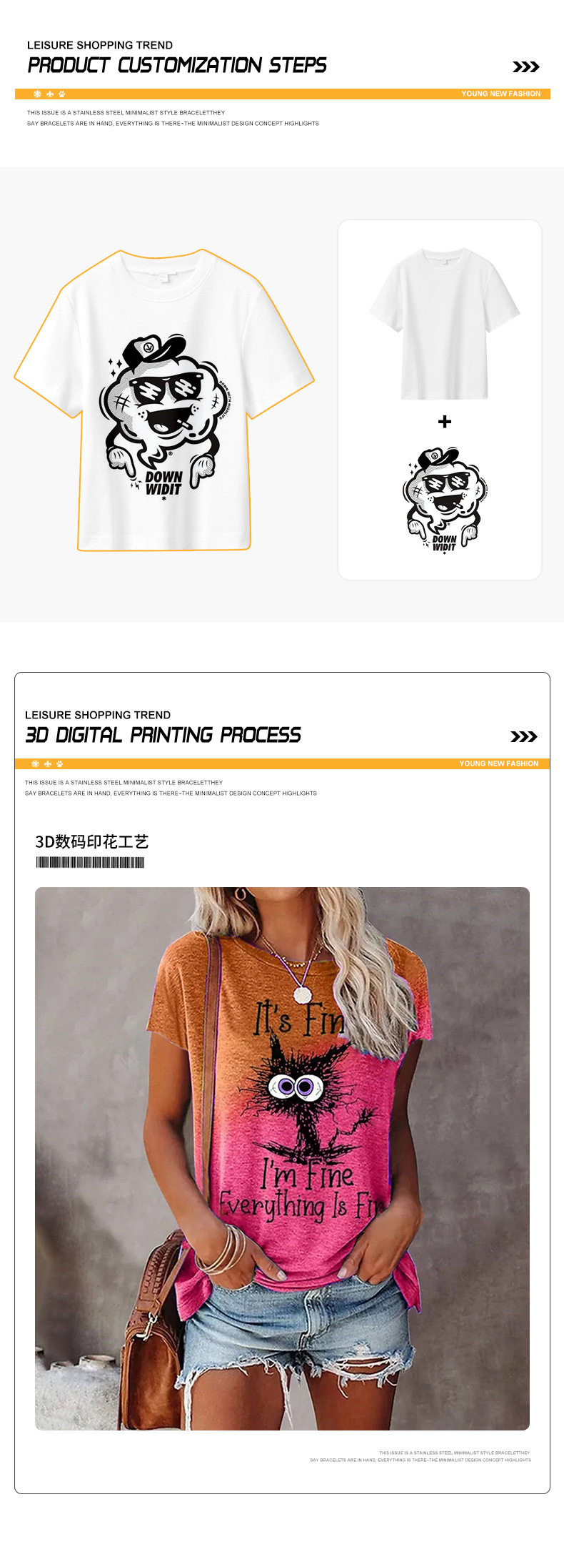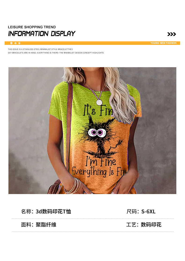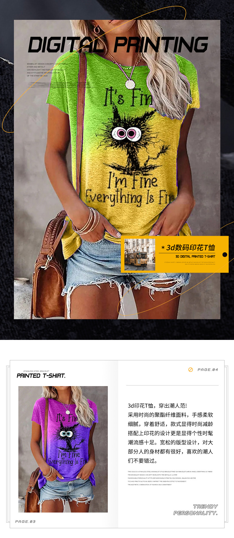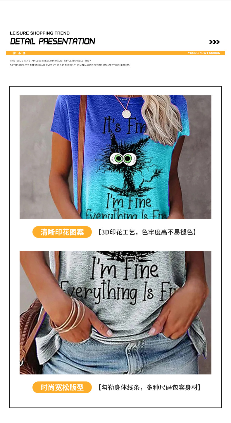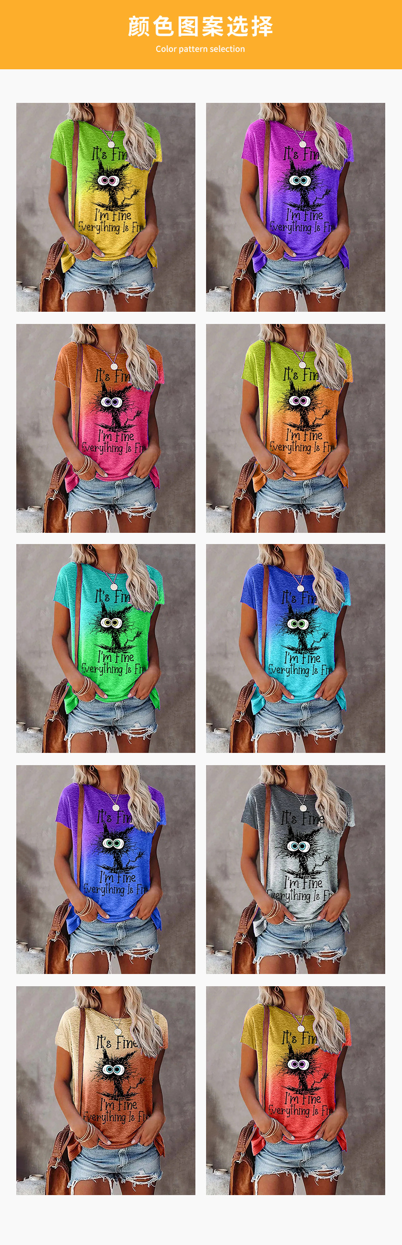 【クロスボーダー専用】2023夏欧米女装temu爆発女性丸襟猫プリントカジュアル半袖