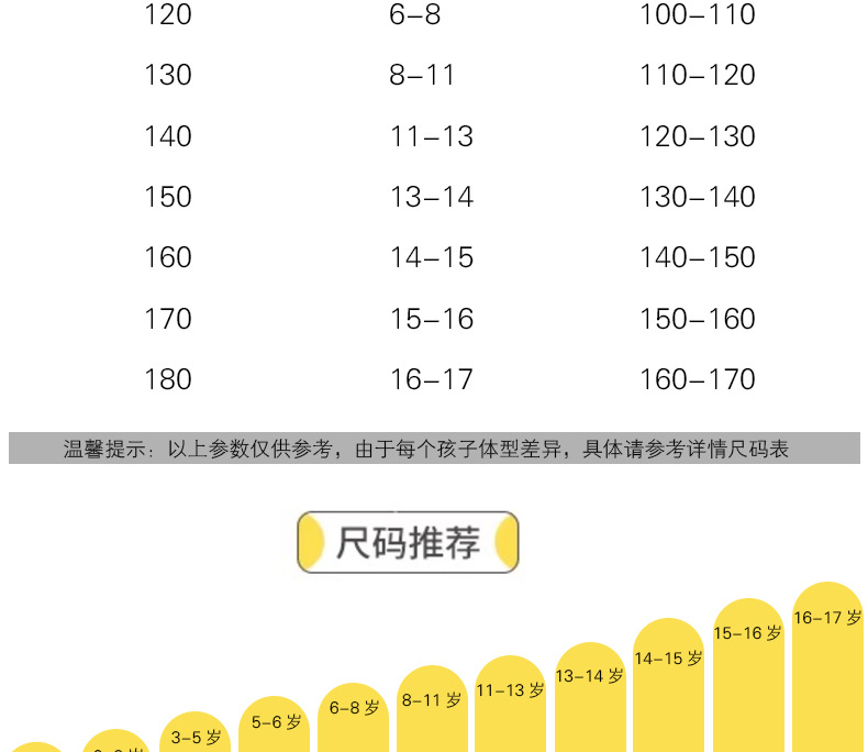 サイズ 80 [推奨身長 60-70CM],サイズ90 [推奨身長70-80CM],100 [推奨身長 80-90CM],サイズ 110 [推奨身長 90-100CM],サイズ 120 [推奨身長 101-110CM],サイズ 130 [推奨身長 110-120CM],140 [推奨身長120-130CM],サイズ 150 [推奨身長 130-140CM],サイズ160[推奨身長140-150CM],サイズ 170 [推奨身長 150-160CM],サイズ 180 [推奨身長 160-170CM]