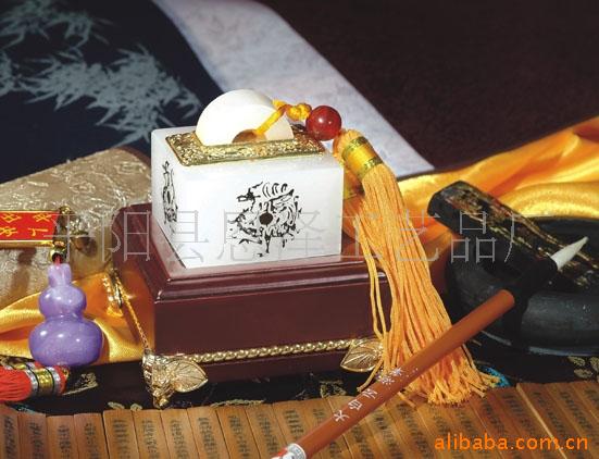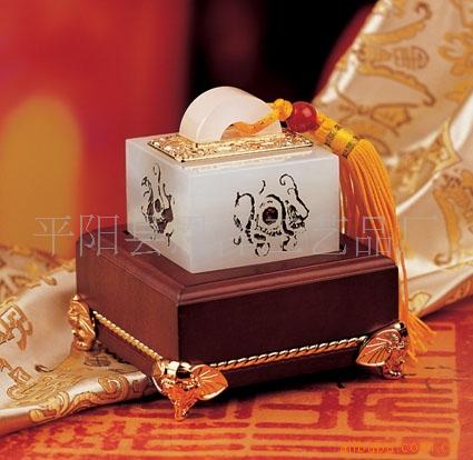 此印章以中国传统名贵材质玉石和金属制作,金属部分以刻金属件镶嵌,精工细雕,栩栩如生。饰纹或雅菊惠兰,或花开富贵,镀24k金。整个产品既富有地方特色,有蕴涵传统文化,尊贵又不失高雅,是办公用品,或商务赠品的理想产品。