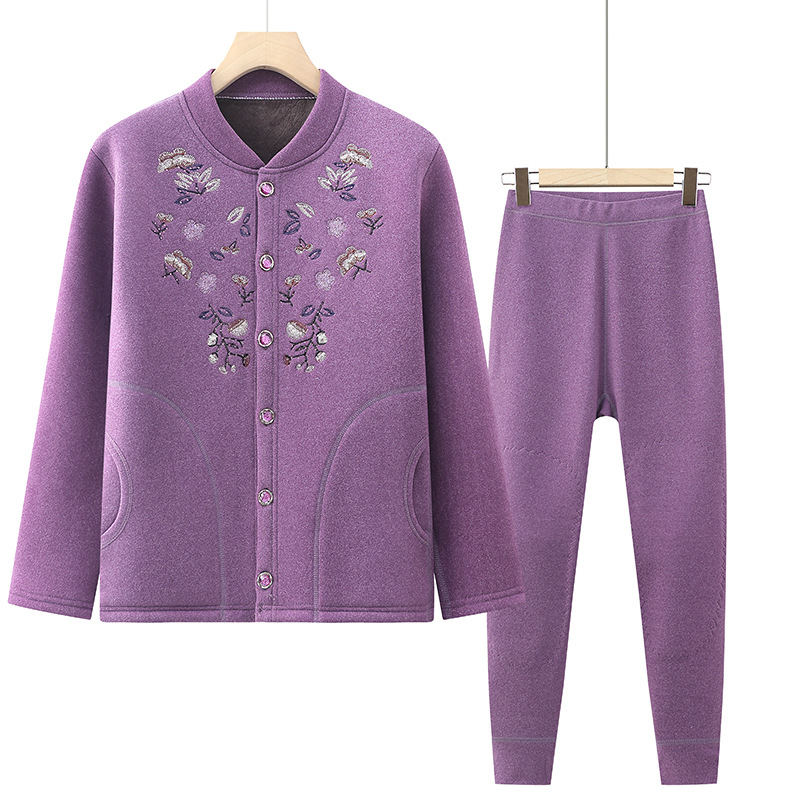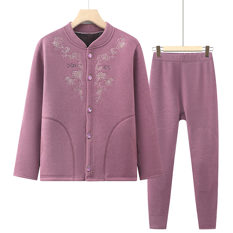 お年寄りの保温下着の女性のベルベットの厚いスーツの老人の保温服のお母さんの秋の服の秋のズボンのおばあさんのカーディガン