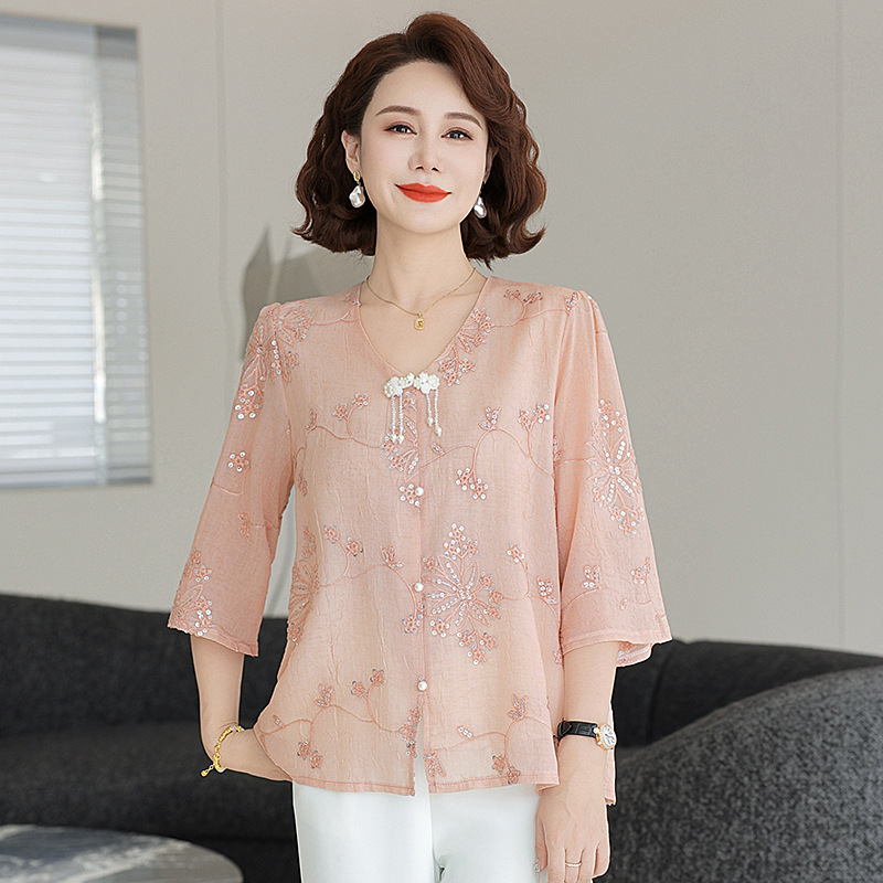 ファッションの洋風のお母さんは春夏の新型vネックの中袖のtシャツの気質の中で年配の女性がゆったりしていてやせている上着を現します。