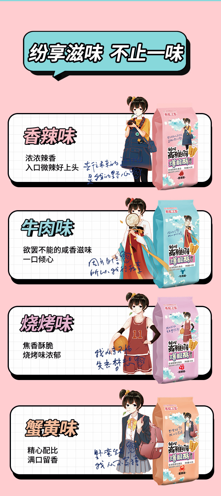 辛味、牛肉味、バーベキュー味、カニ黄味