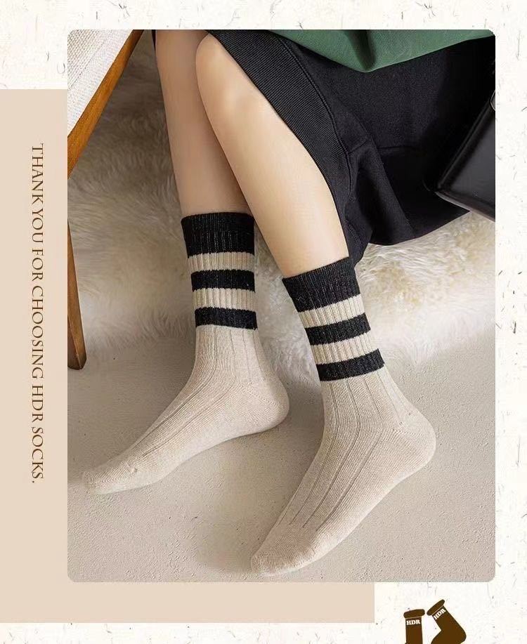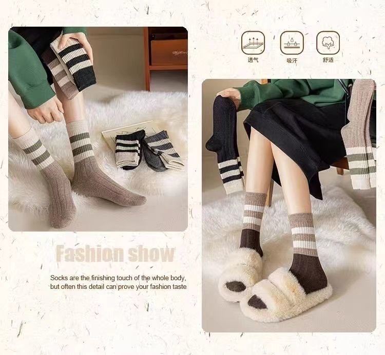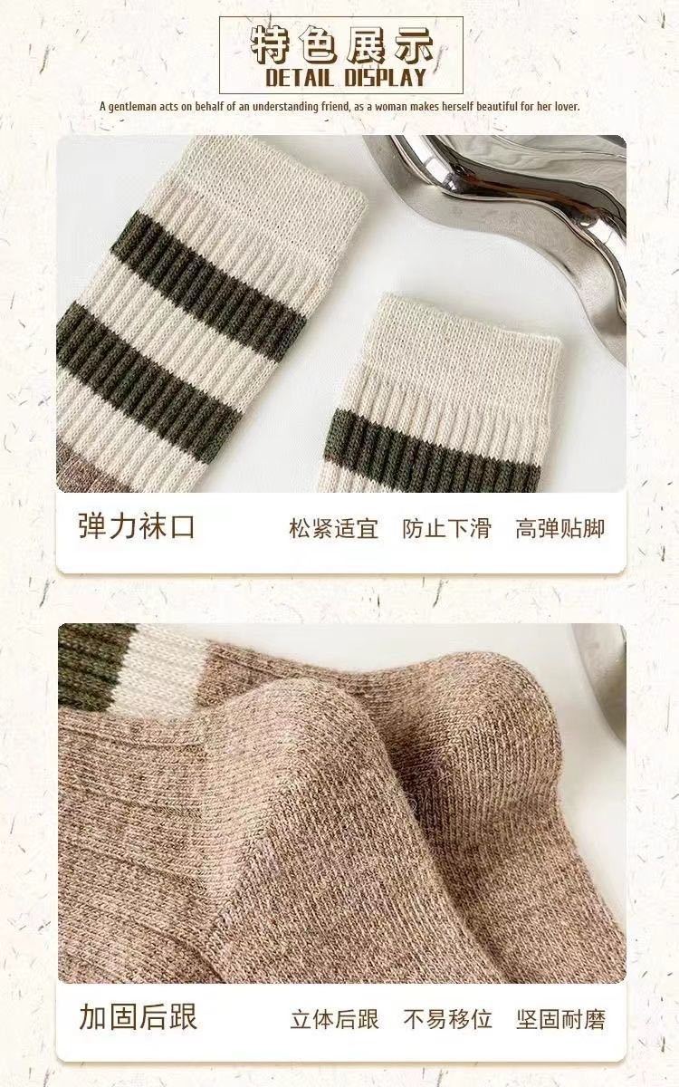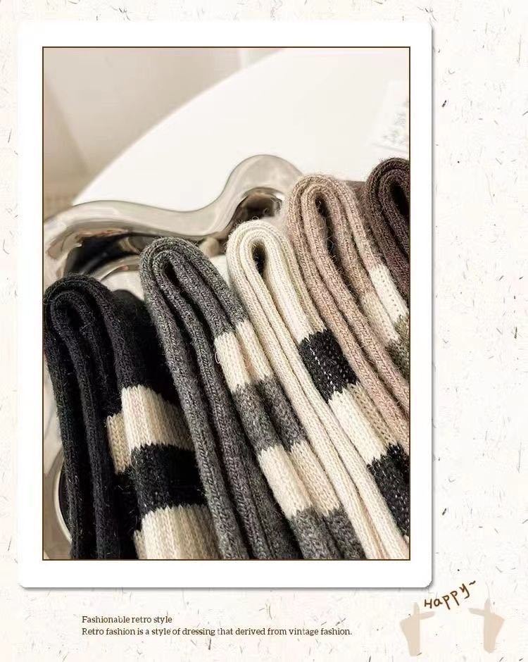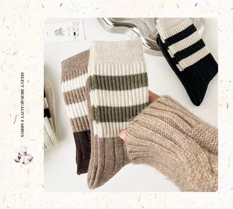 秋冬用厚手ストライプテリーソックス レディース ミドル丈 裏起毛 暖かい 日本風 レトロ ミドル丈 レディース フロアソックス 学生向け