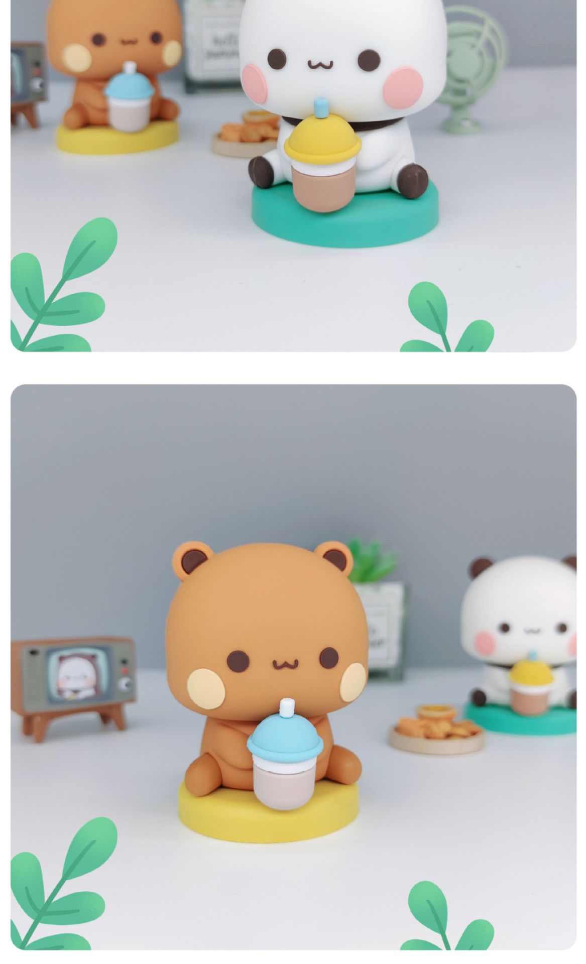 布布一二パンダ人形はデスクトップの車に飾られたアニメ人形を手にして、男女のプレゼントを楽しんでいます。