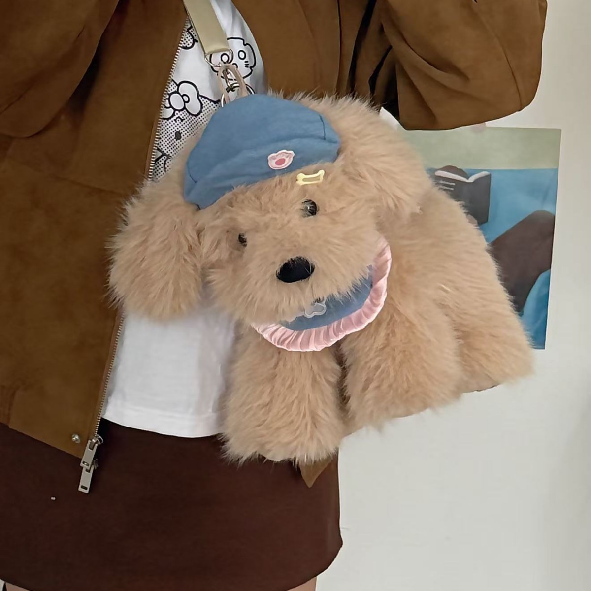 新款可爱毛绒棕色小狗斜挎包时尚百搭休闲公仔单肩包出行轻便背包
