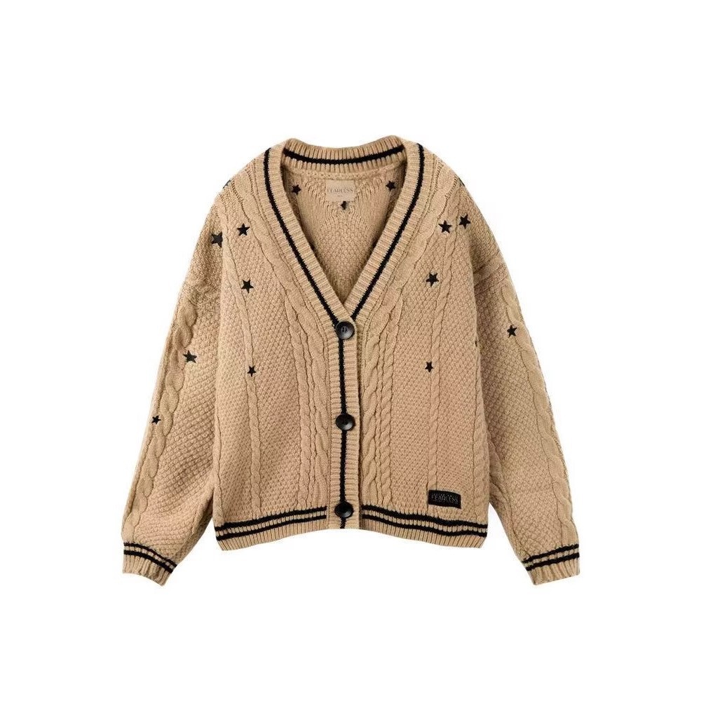 秋冬款气质星星刺绣开衫针织棕色V领欧美时尚百搭休闲毛衣外套