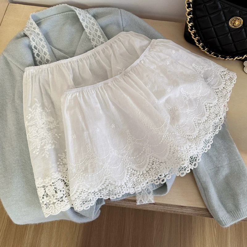 白い小さめスカート付きレディーススウェットシャツ、重ね着スタイル、シャークパンツ、秋冬、お尻を隠す、フェイクツーピース、大きな裾