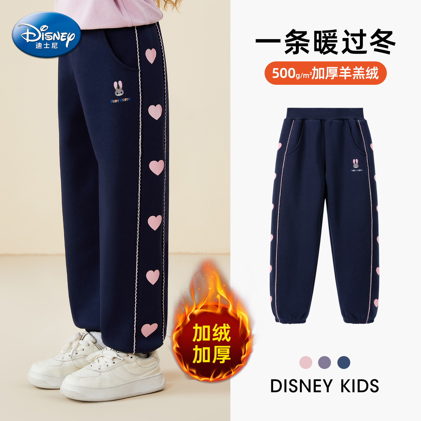 兔子警官羊羔绒加绒运动裤25冬款女童甜美爱心侧边条束脚裤保暖裤