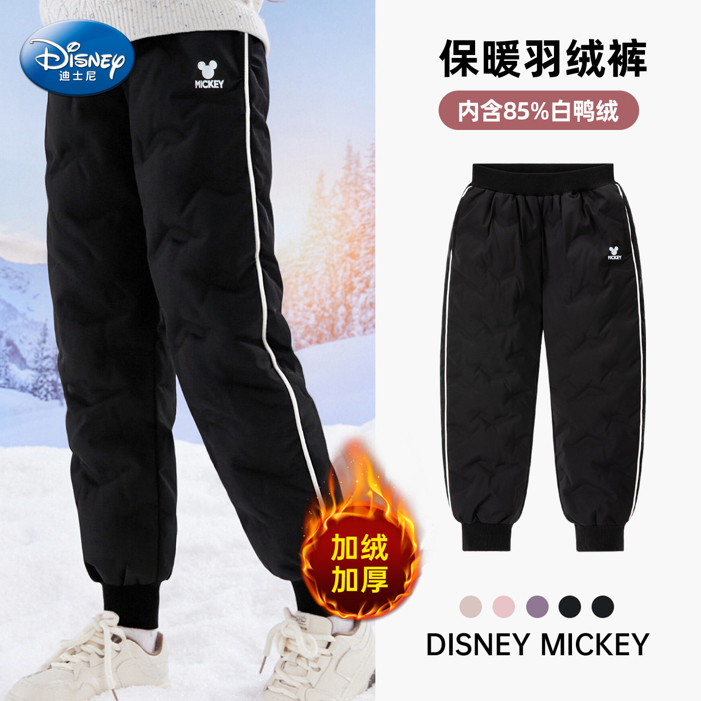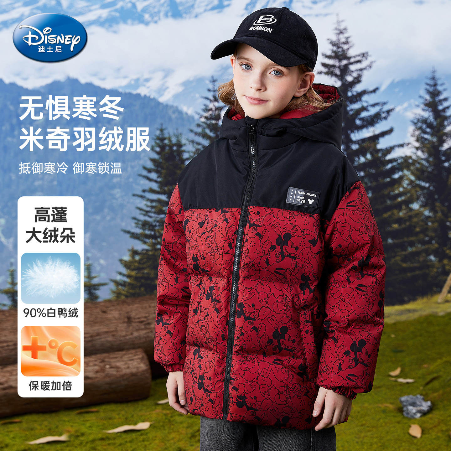 米奇满印男童羽绒服25冬中大童保暖御寒连帽面包服时尚撞色外套