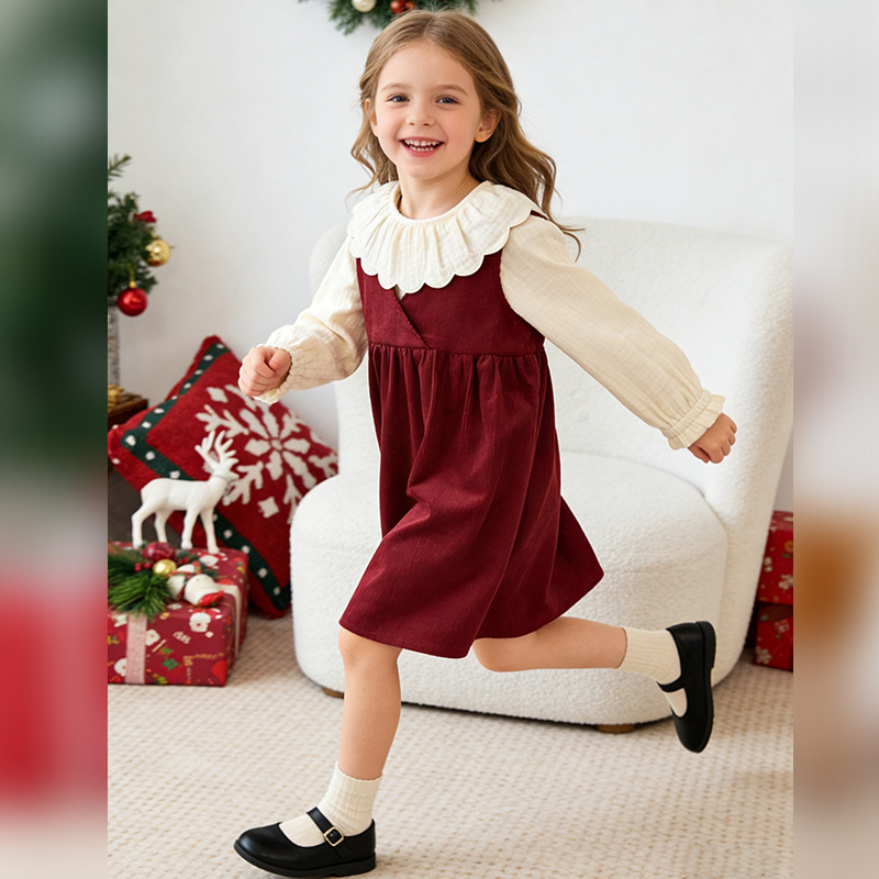 新年コーデュロイプリンセスドレス 女の子用 ベビー服 26春秋新作 子供服 ゴム入り襟付き パレス風 綿100%ワンピース