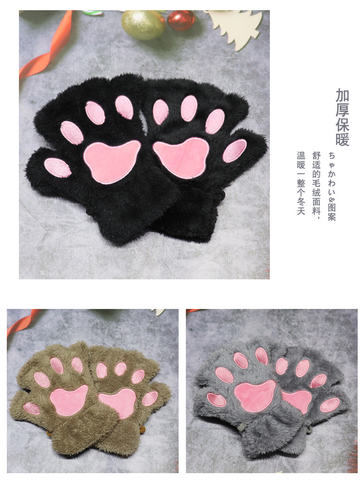 秋冬可爱猫爪半指毛绒手套学生写字加绒漏指保暖半指熊掌手套跨境