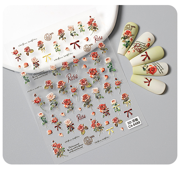 5dレリーフ立体ネイルシールレトロバラの花柄ボーダー蝶結び英語アルファベット爪飾り