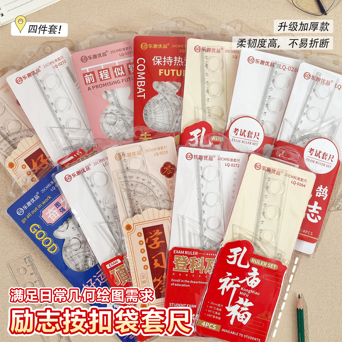 创意励志文字套尺学生四件套高颜值20cm尺子绘图套装学习文具批发