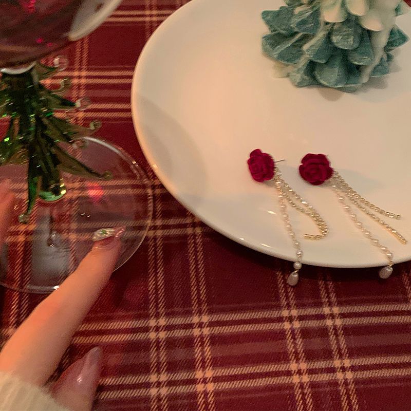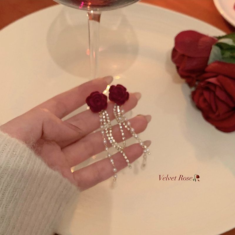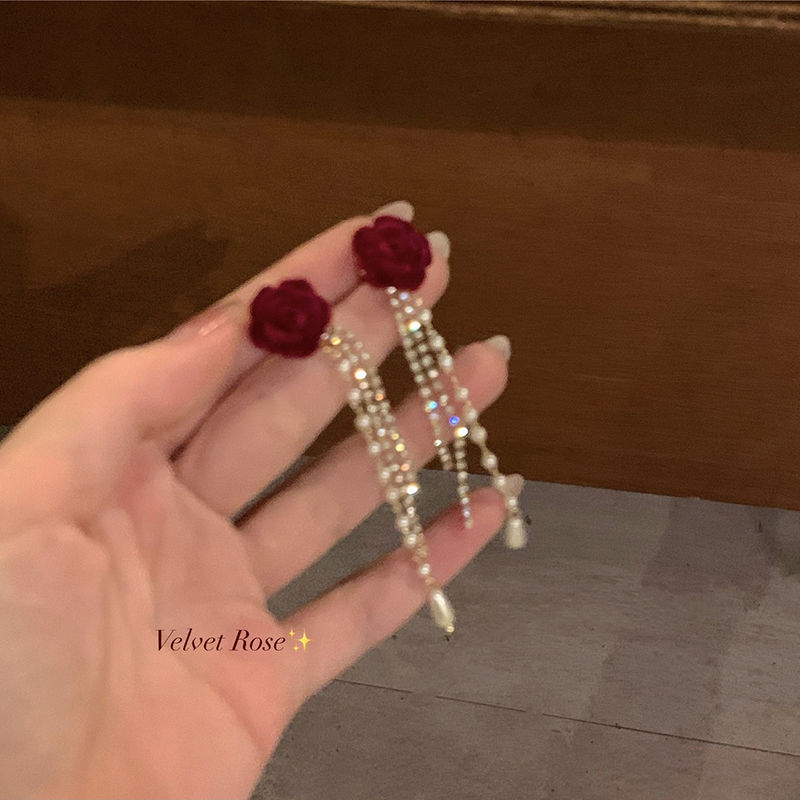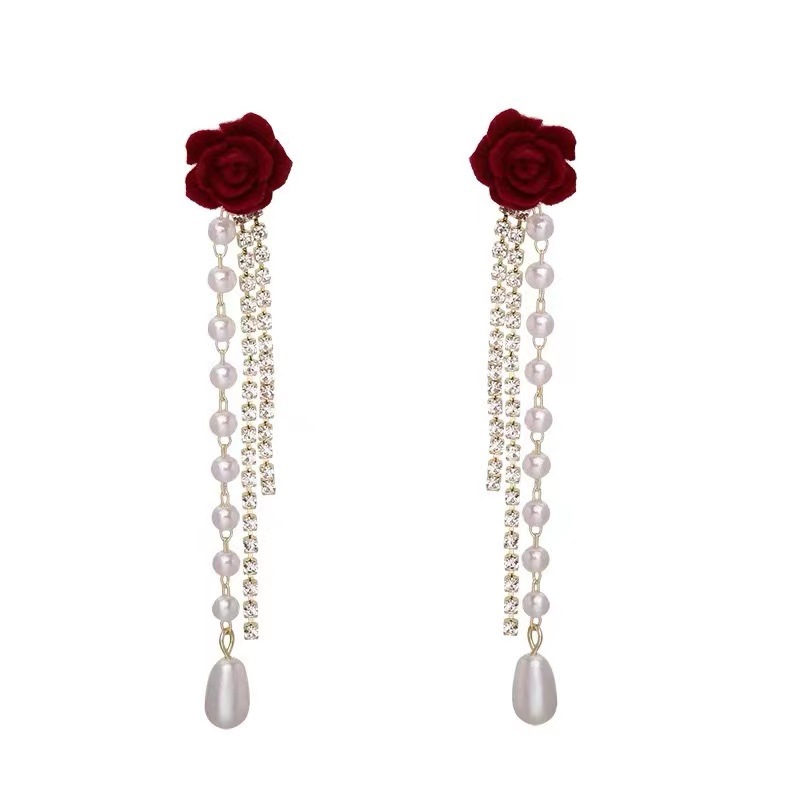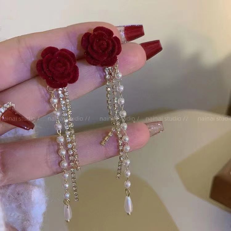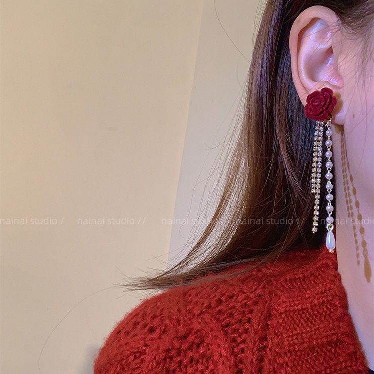 ツバキの花流蘇ピアス ~ 赤いベルベットの長いイヤリングバラ2023年の新しい高級感真珠イヤリング