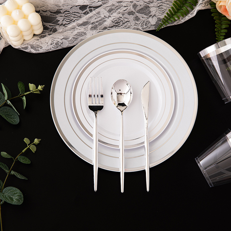 シルバー模造金属プラスチックナイフフォークスプーンシンプルなドリル使い捨てグリーン環境保護メッキ
