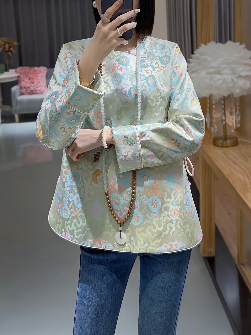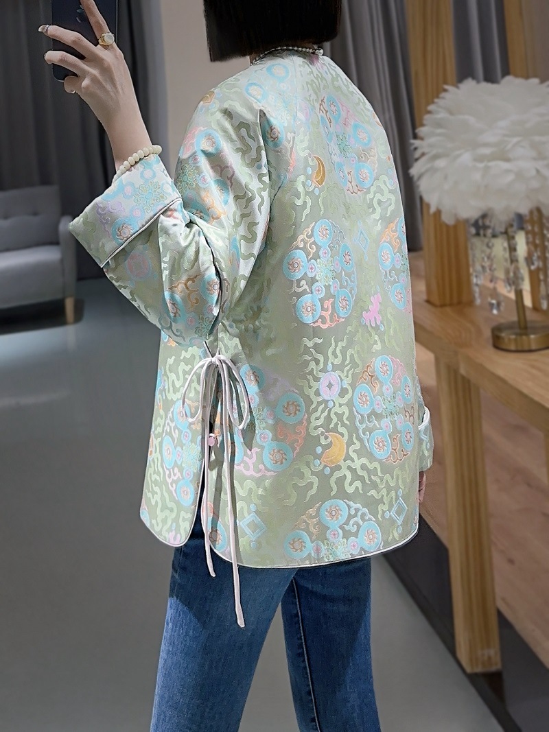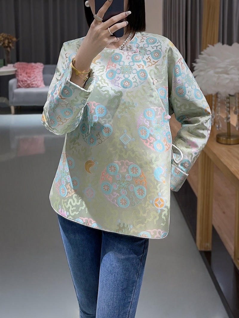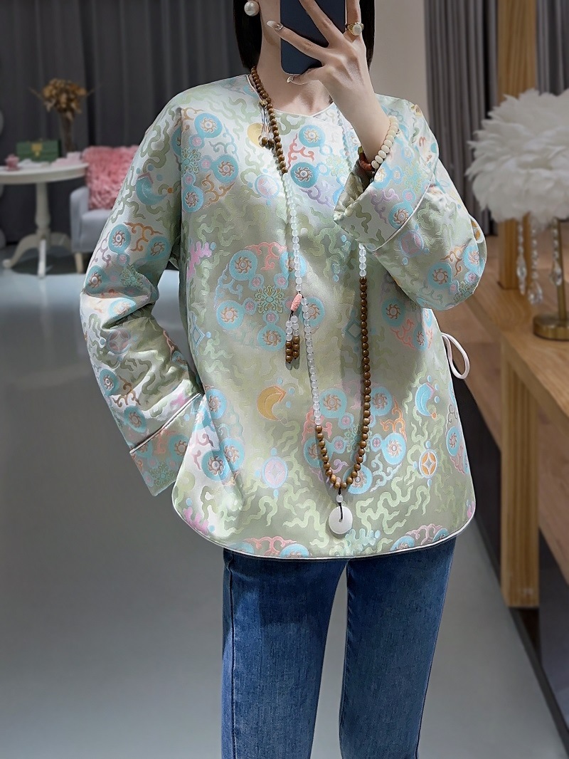 蘭汐の新型ファッション新中国式は宋錦交織ジャカードの丸首の長袖の気質をまねて綿の小さい綿の服を挟みます。