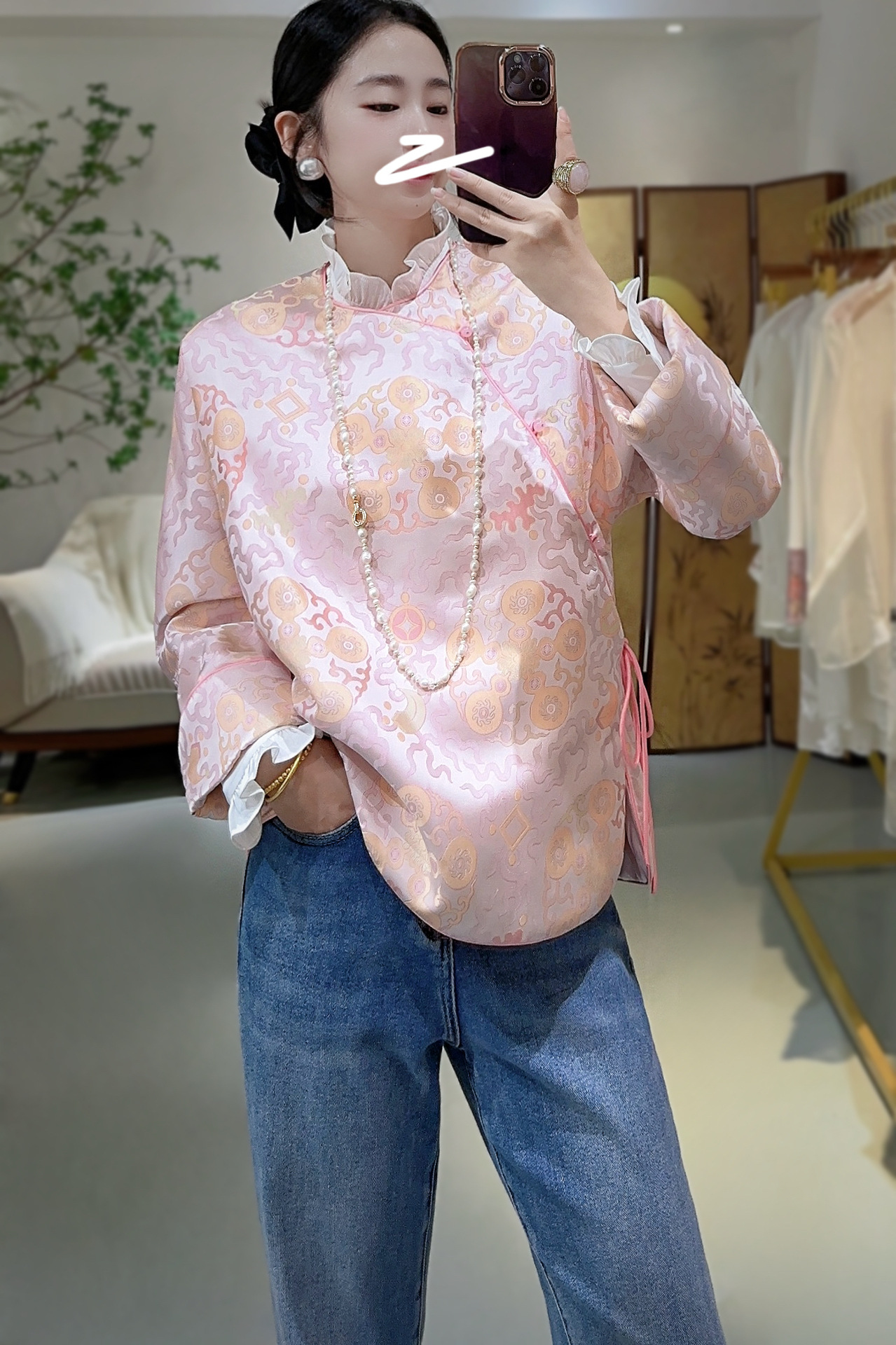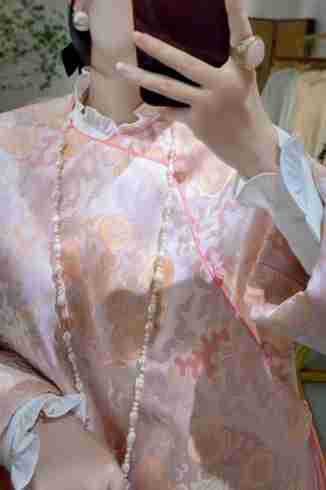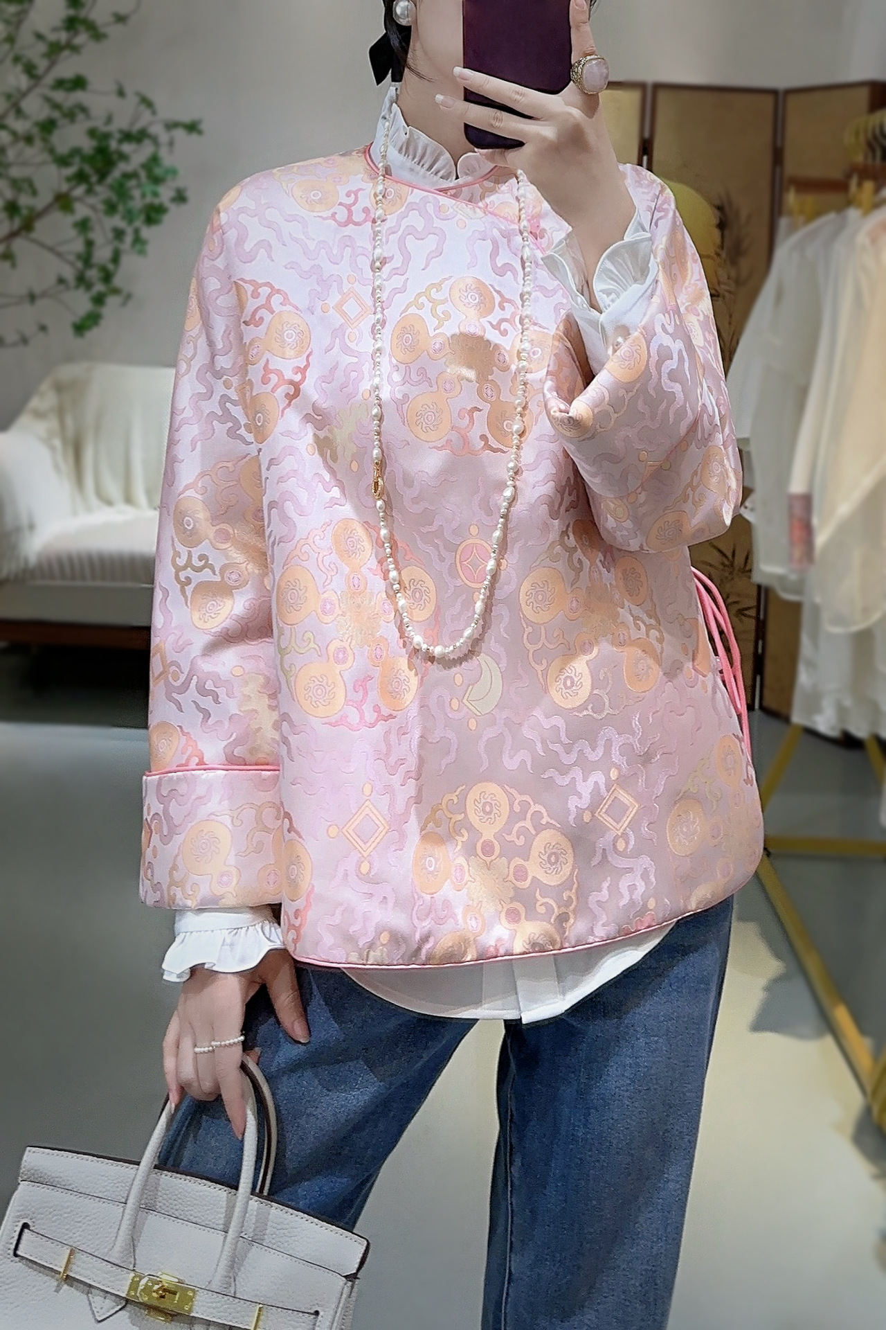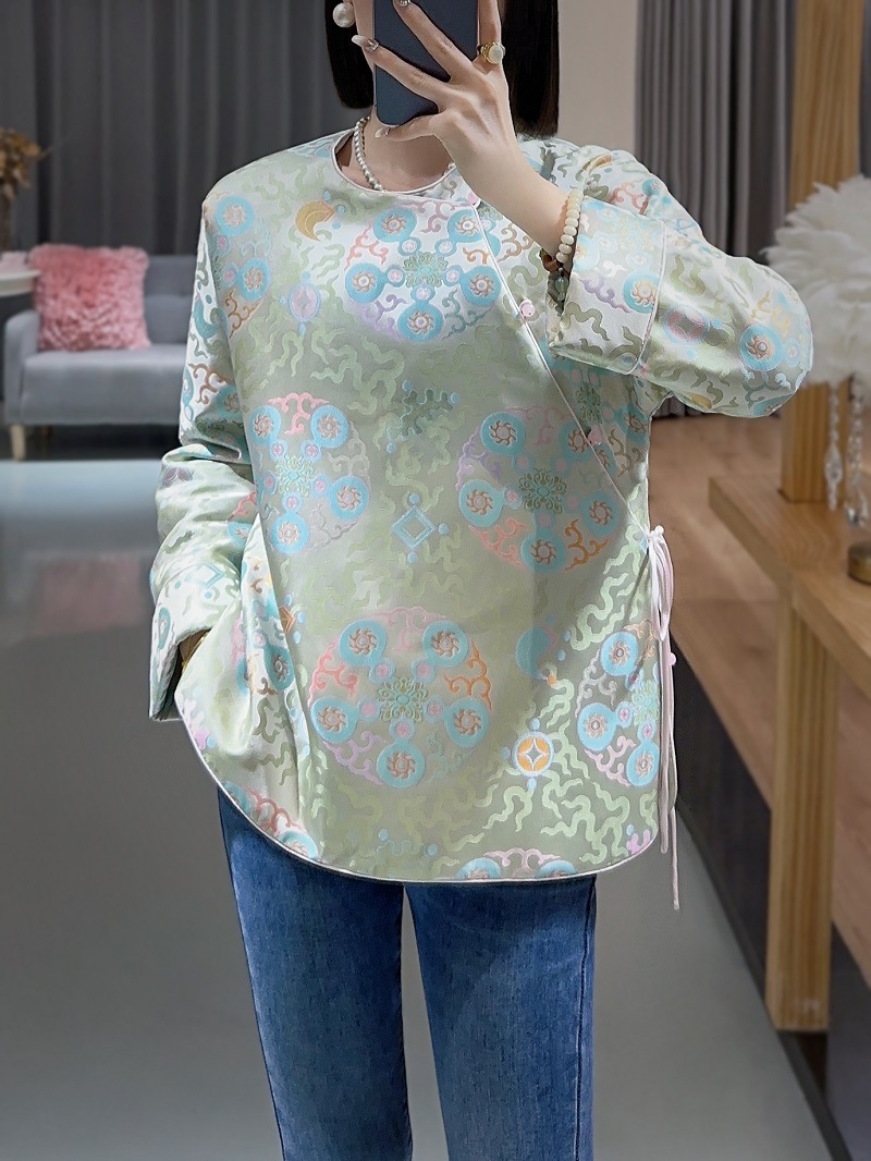 蘭汐の新型ファッション新中国式は宋錦交織ジャカードの丸首の長袖の気質をまねて綿の小さい綿の服を挟みます。