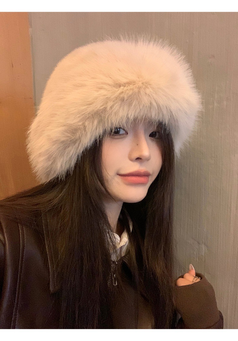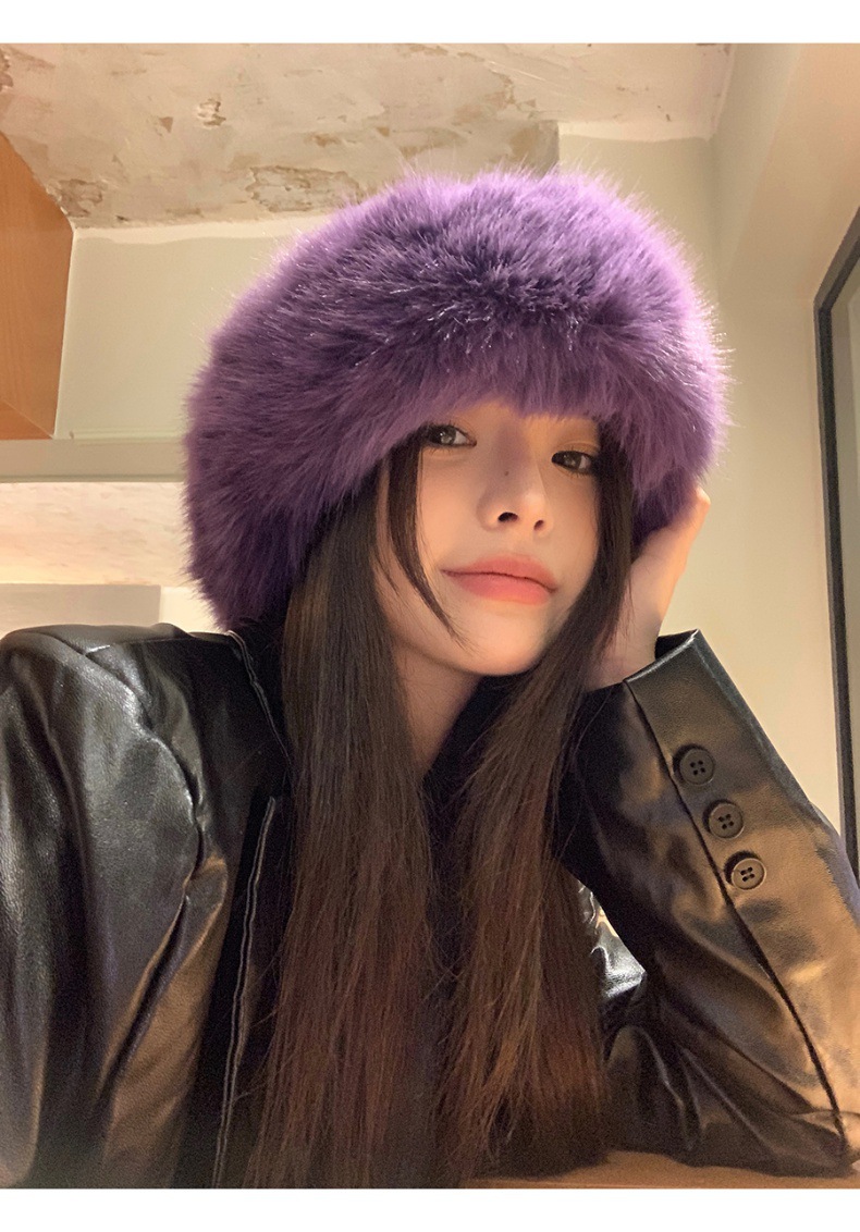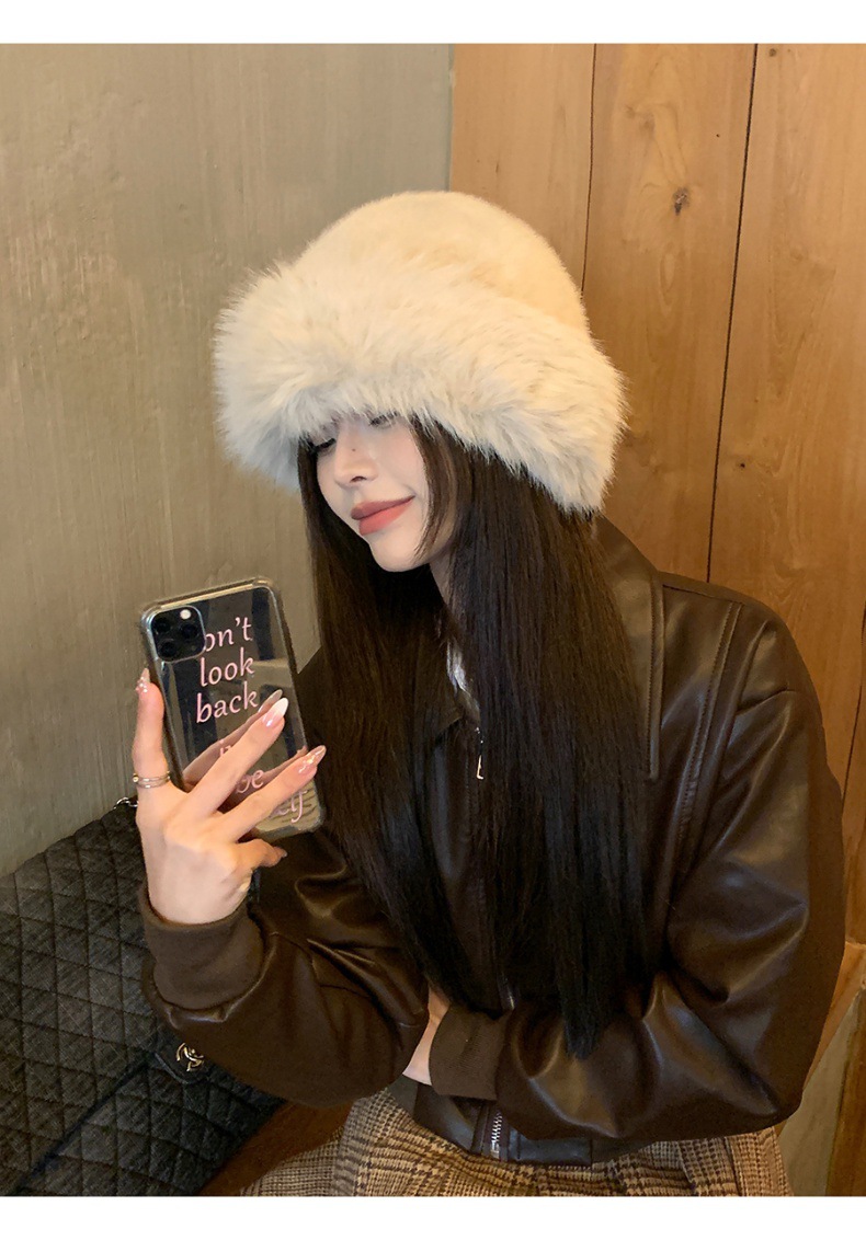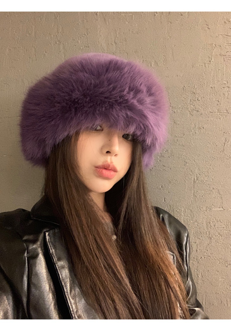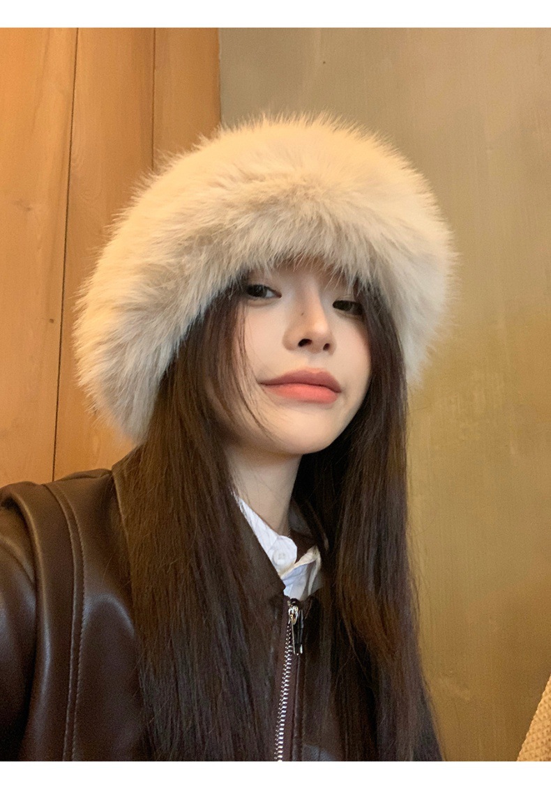 秋冬のぬいぐるみの韓国系の毛糸帽子の女性モデルはウサギの毛に似せています。