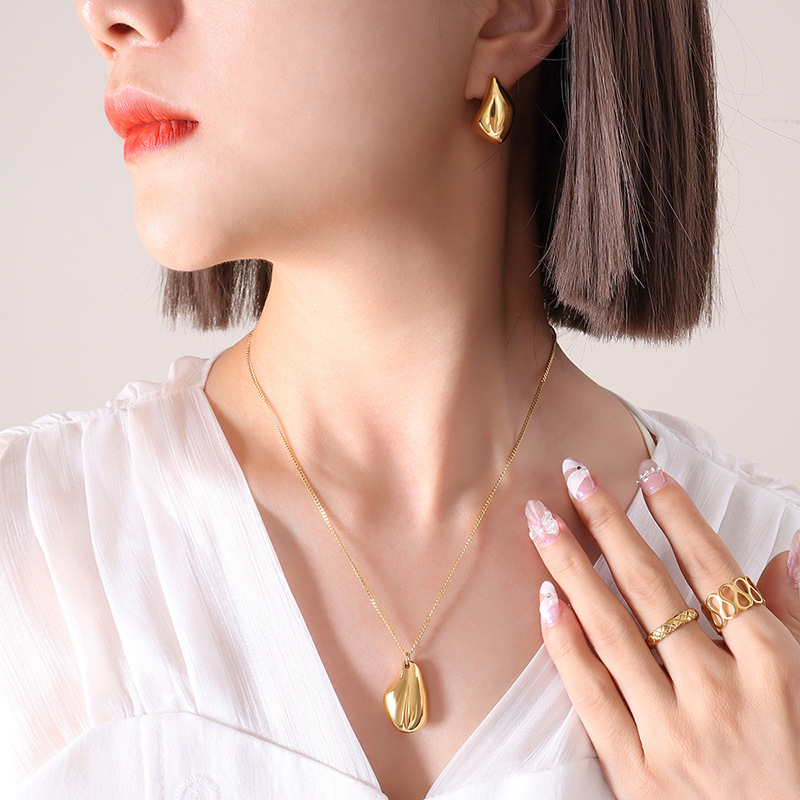 韓国系トレンドins風個性百合チタン鋼メッキ18k金光面異形ペンダントネックレスイヤリングアクセサリーセット