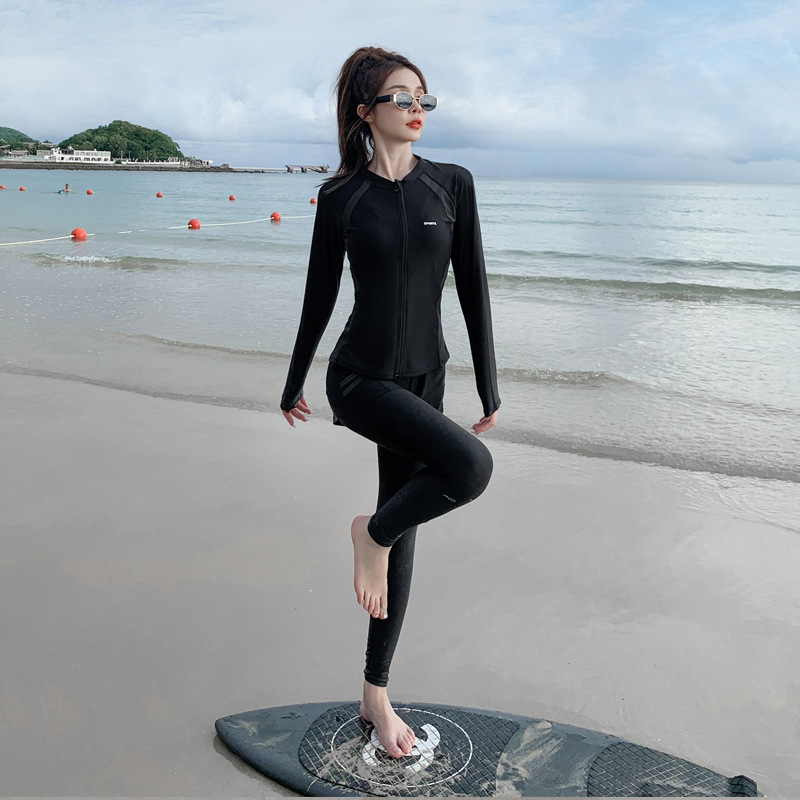 水着の女性の大きいサイズの分体の長袖のズボンの日焼け止めの速乾の保守的な修身はやせているクラゲの服の浮く潜水服の女性を現します。
