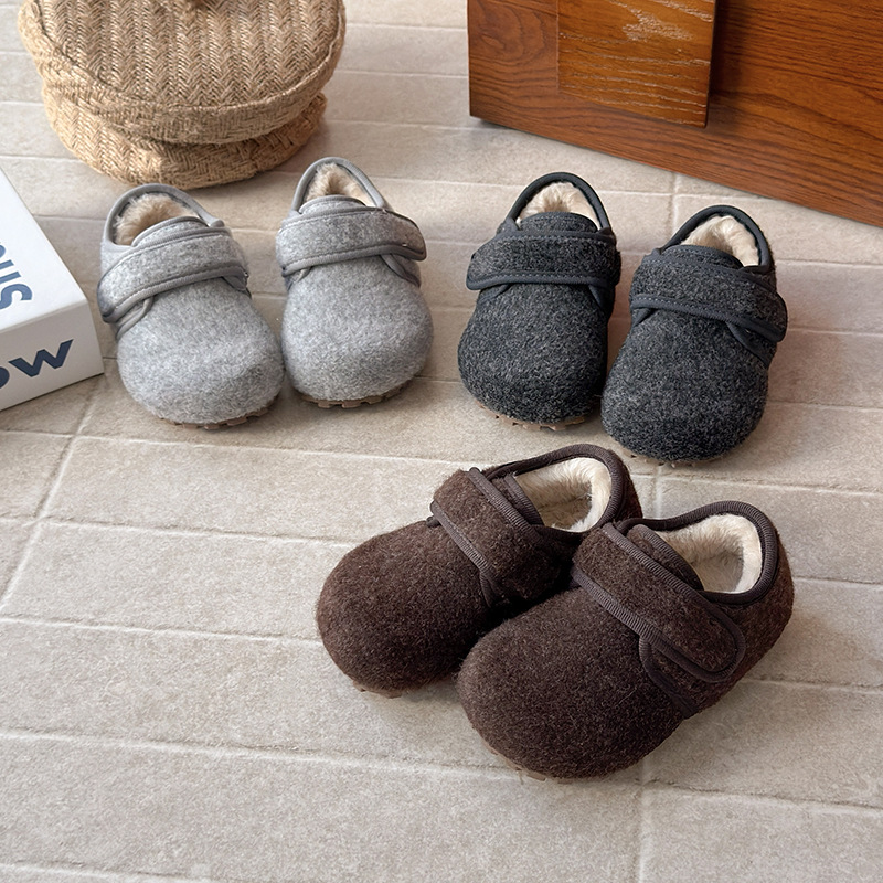 ins子供用レトロコットンシューズ2025冬新作韓国版男の子用ベルベットビーニーシューズ女の子用暖かい毛皮の靴