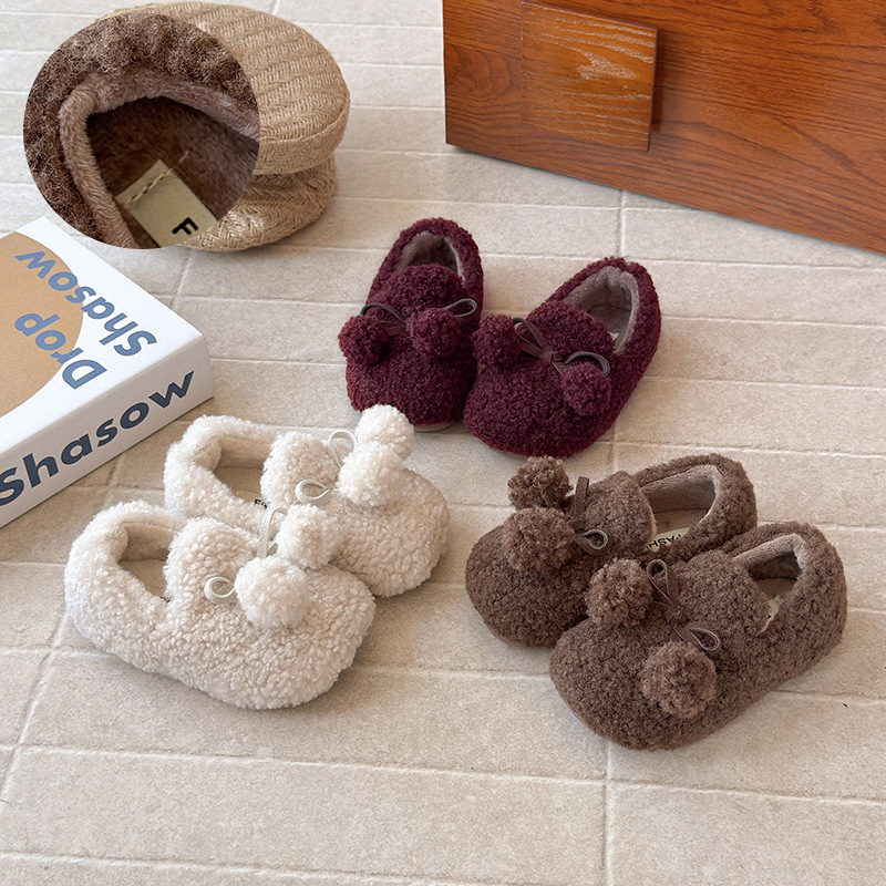 女の子用綿靴 2025秋冬新作 韓国風 無地 リボン付き ファーシューズ 軽量 子供用 裏起毛 ドゥドゥシューズ