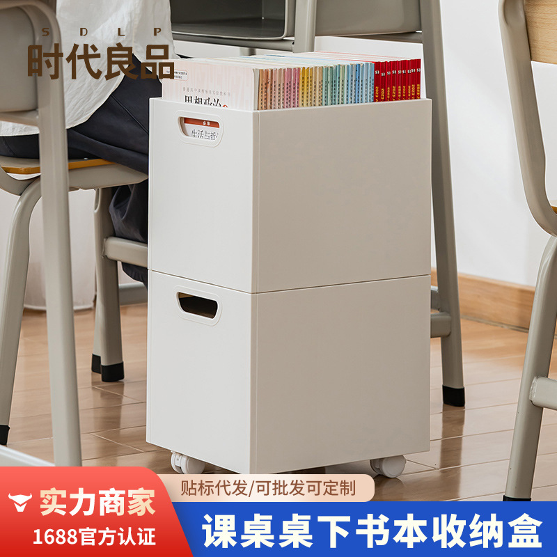 机の下の本棚のカバンはかごを収納して滑車を持っています。