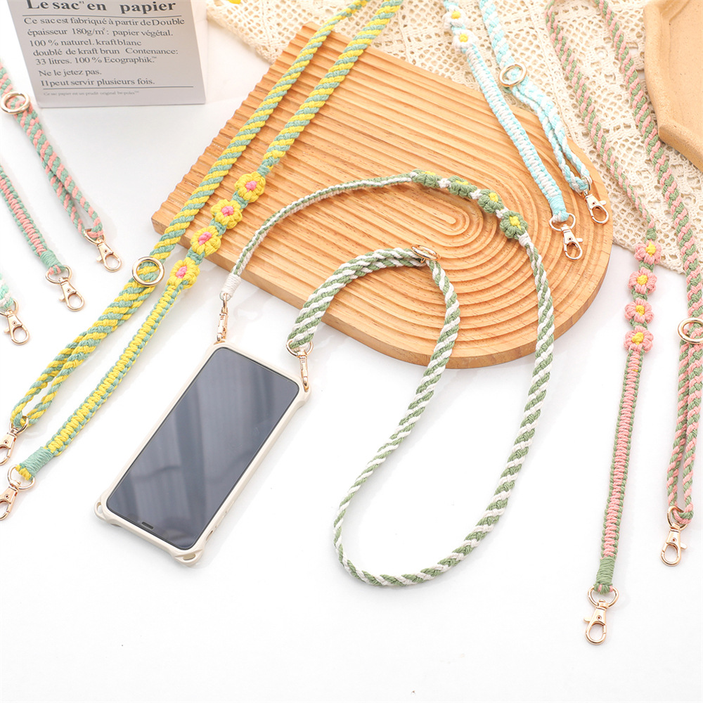 手編みの小さいデイジーの花のキーはボヘミアンの携帯電話のバックパックを掛けます。