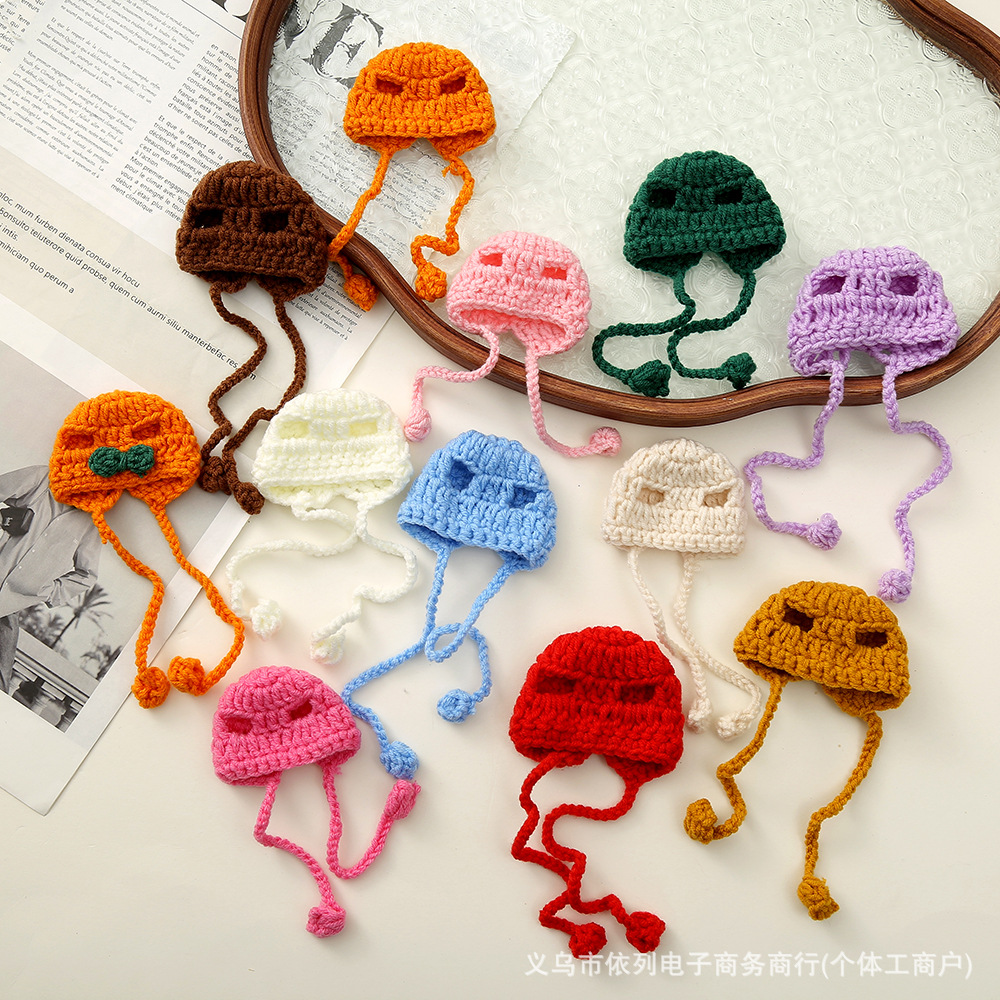 ウールニットストラッププルオーバー帽子、手作りのかぎ針編みベビー服製品、かわいい犬人形、ミニ帽子アクセサリー卸売