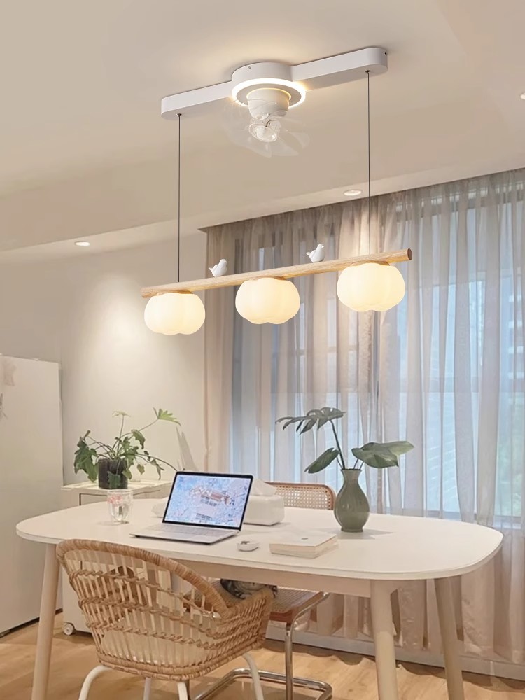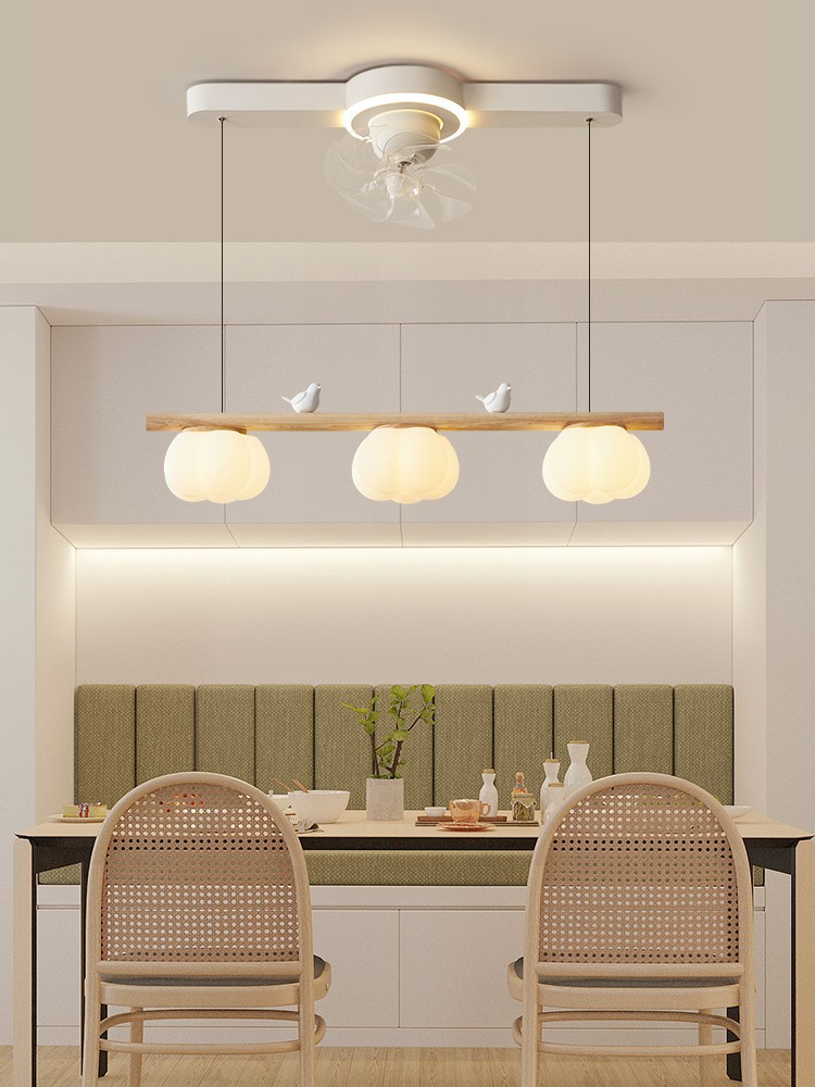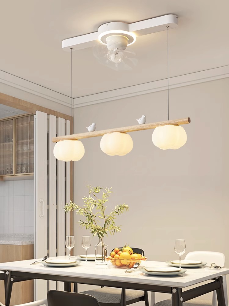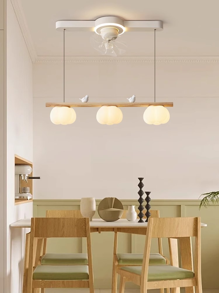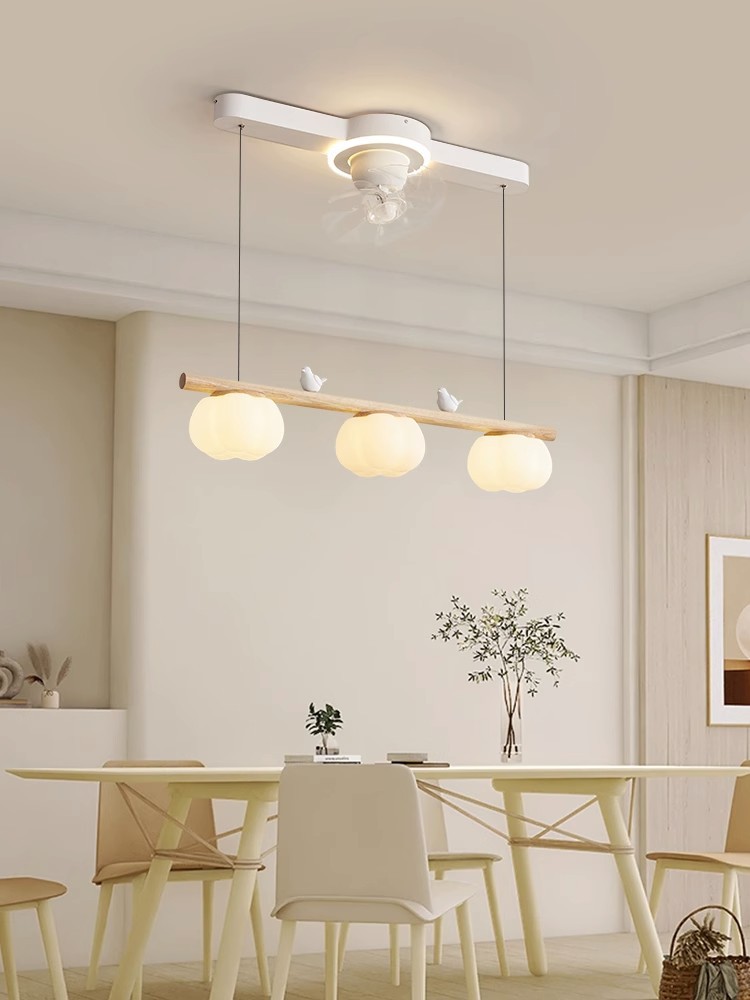 2024年新型レストランファンシャンデリア首振りファンランプシンプル原木クリーム小鳥綿シャンデリア