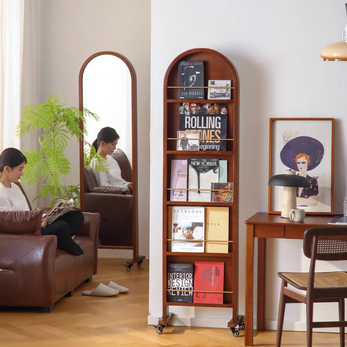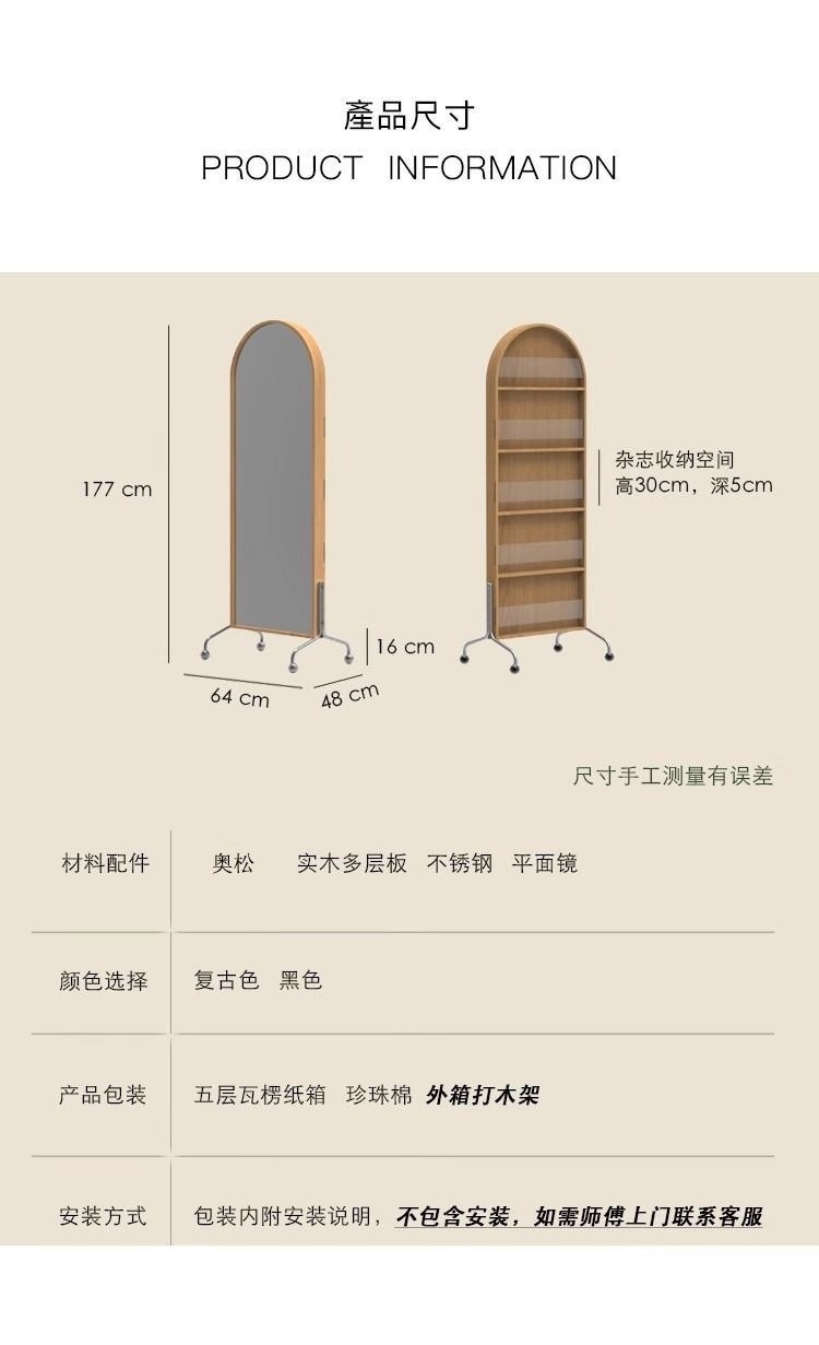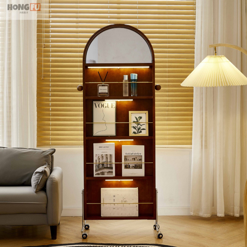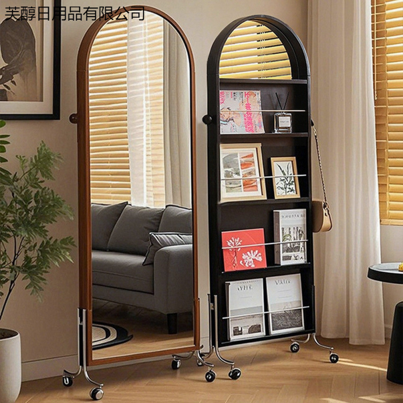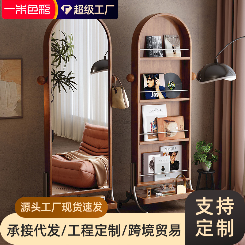 中古风落地穿衣镜实木可移动试衣镜书架一体客厅卧室置物收纳镜子
