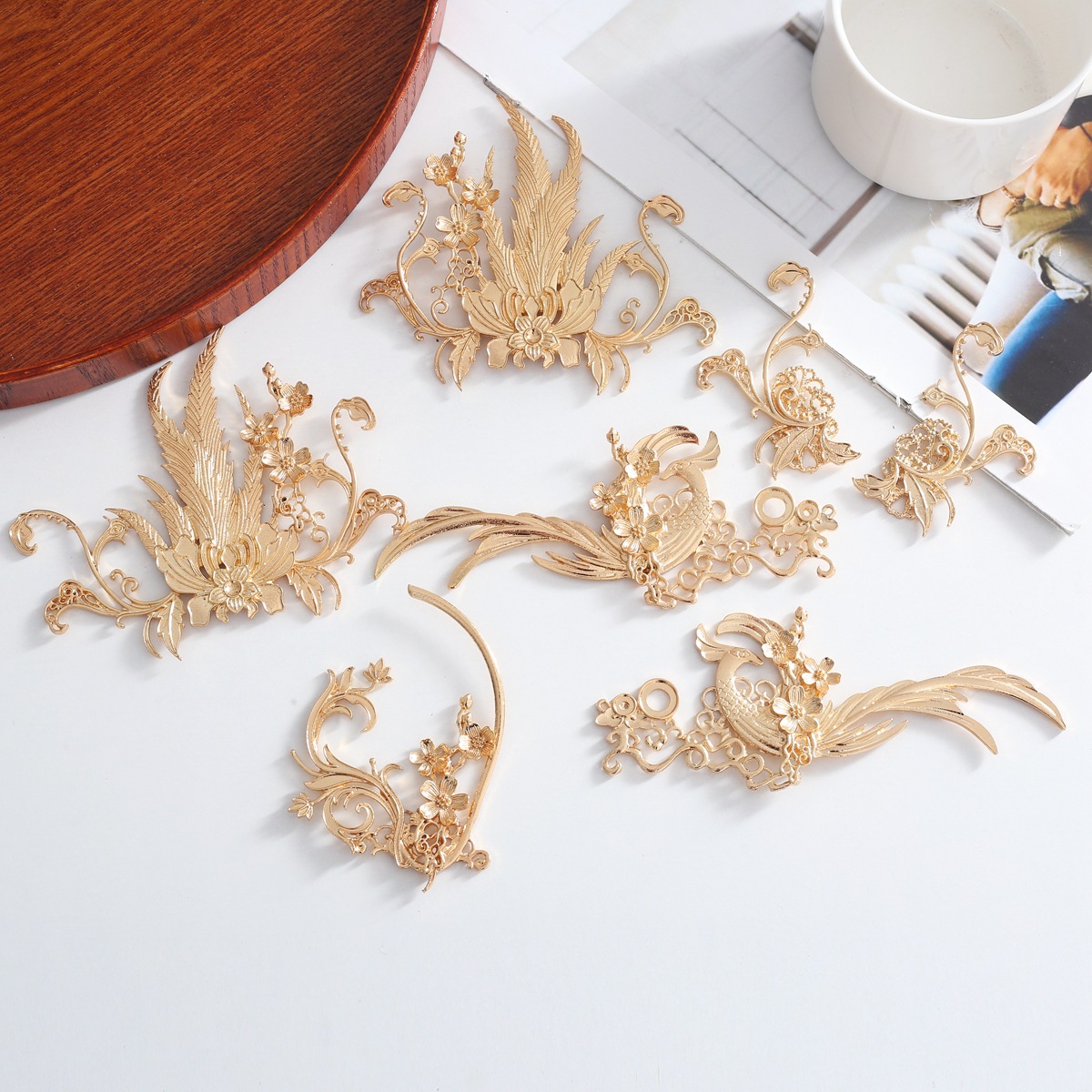 金属透かし彫り立体花蝶花弁花片孔雀三日月歯diy古風花嫁髪アクセサリーアクセサリー