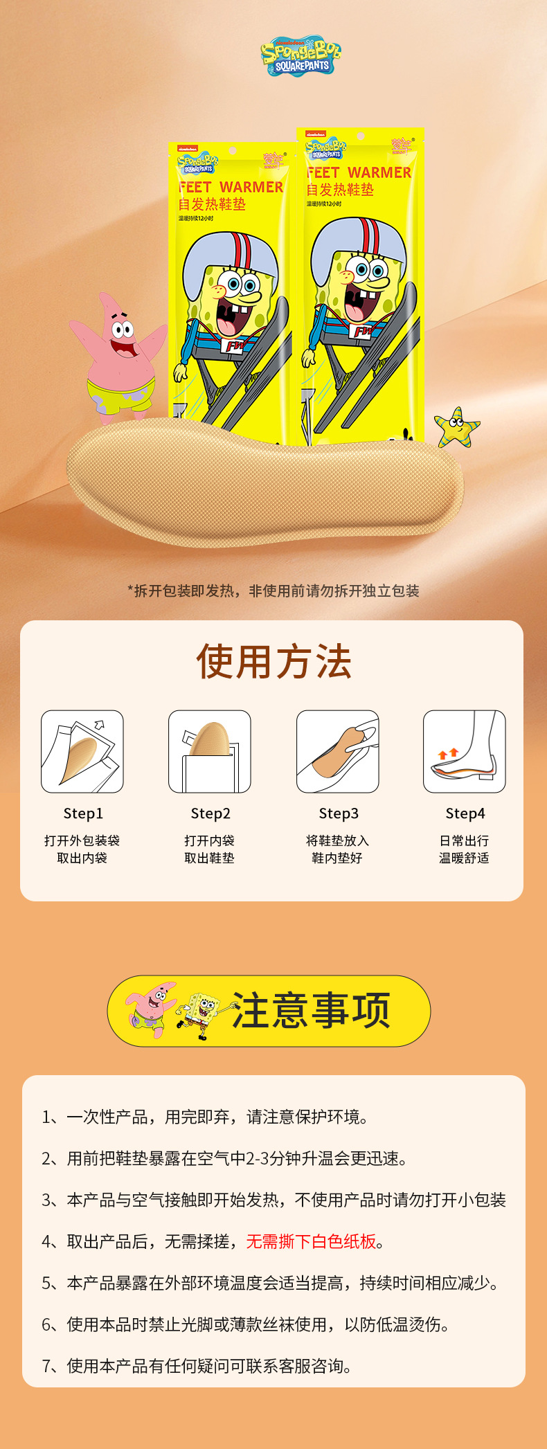 男性用ヒイラギ自己発熱インソール、スポンジボブ発熱フットウォーマー、全足用、歩行可能、使い捨て加熱インソール