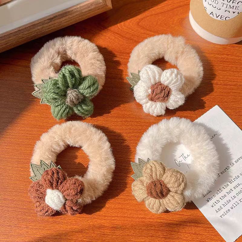ミルクカレー色の花の毛糸の髪ひもの女性秋冬のポニーテールの小腸の髪輪の子供はかわいいです。