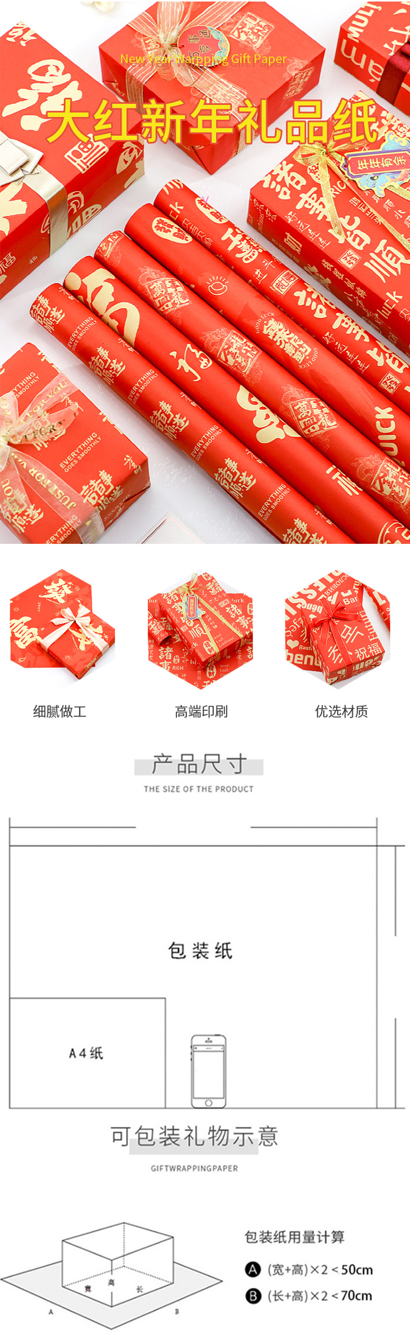 新年プレゼント包装紙中国風おめでたい図包装紙赤いギフト紙超サイズギフトボックス手作り紙