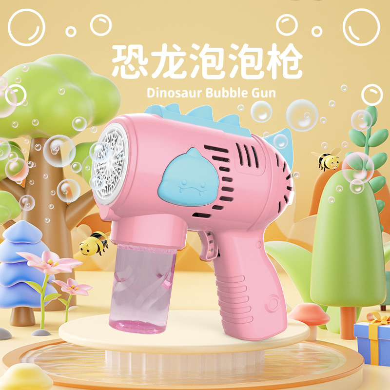 子供は電動アニメ恐竜の泡銃を持って、全自動でカラフルな照明で泡を吹く親子の屋外玩具を持っている