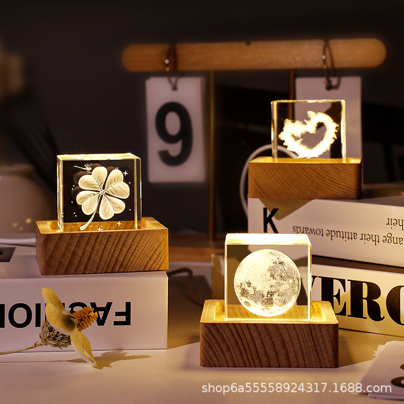 正方形の水晶の置物の発光の小さい夜の明かりの中で工芸品を彫って贈り物を飾ります。