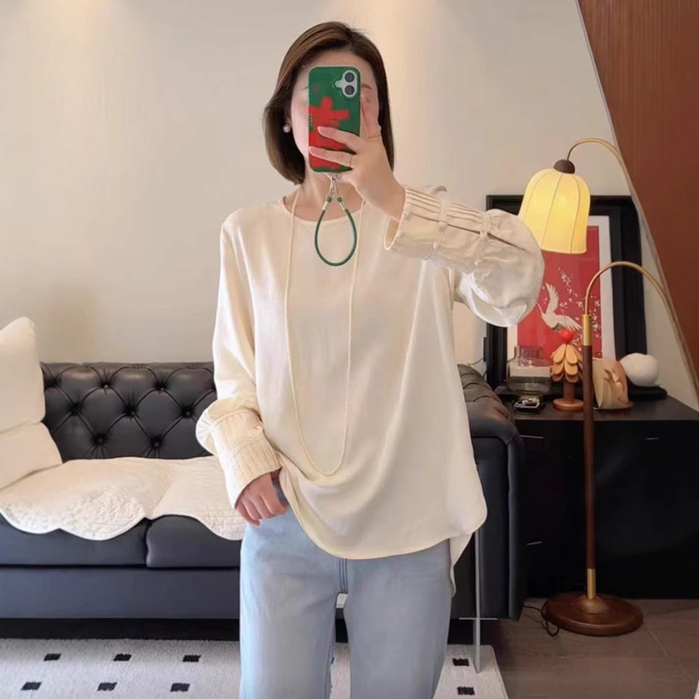新中国風のファッションは長袖の気質の底のシャツの女性の2025春の新しいゆったりしている白い上着のtシャツに似合います。
