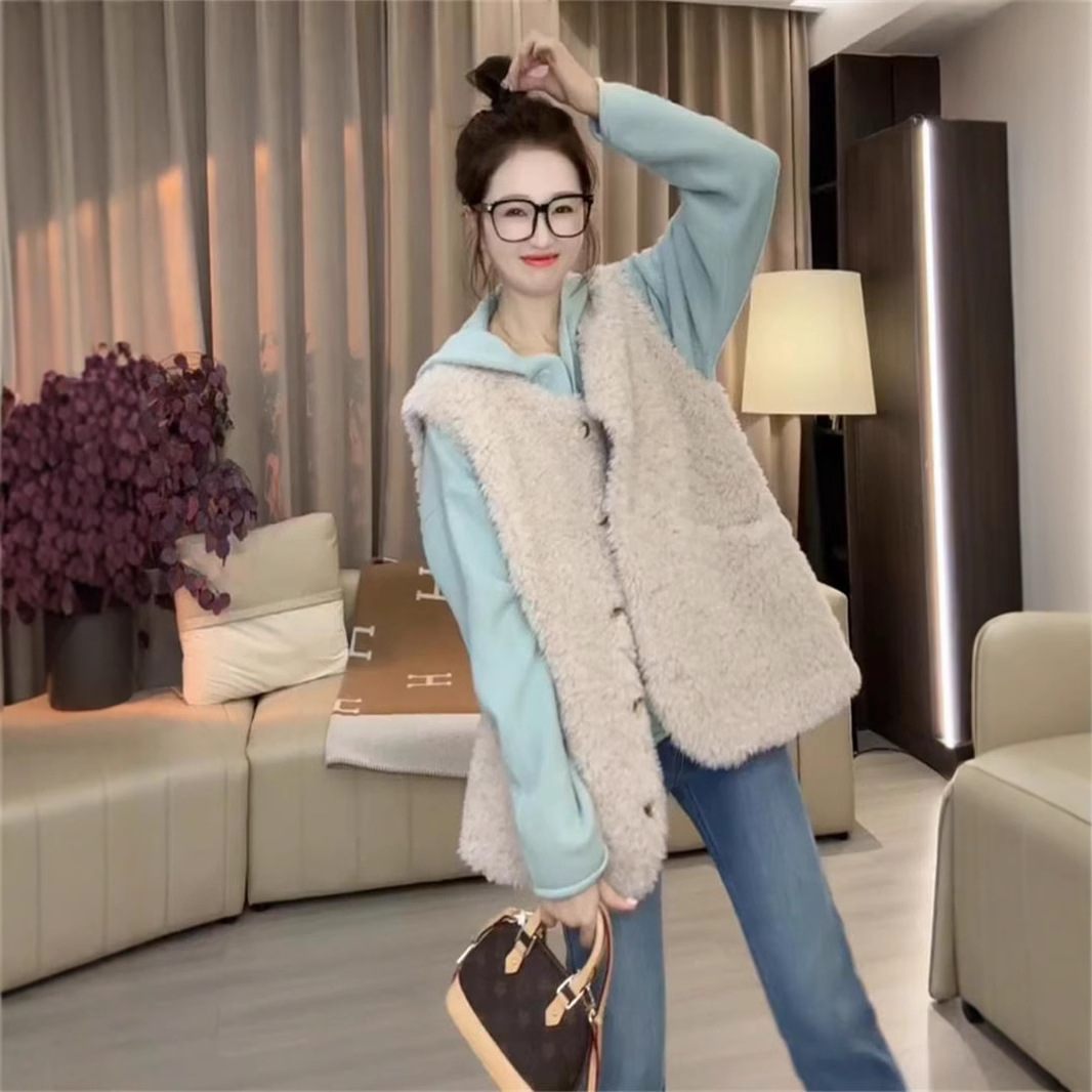 ファッション毛皮一体羊小毛馬甲女2024秋冬の新型のゆったりとした厚手のファッション的な肩の毛の上着