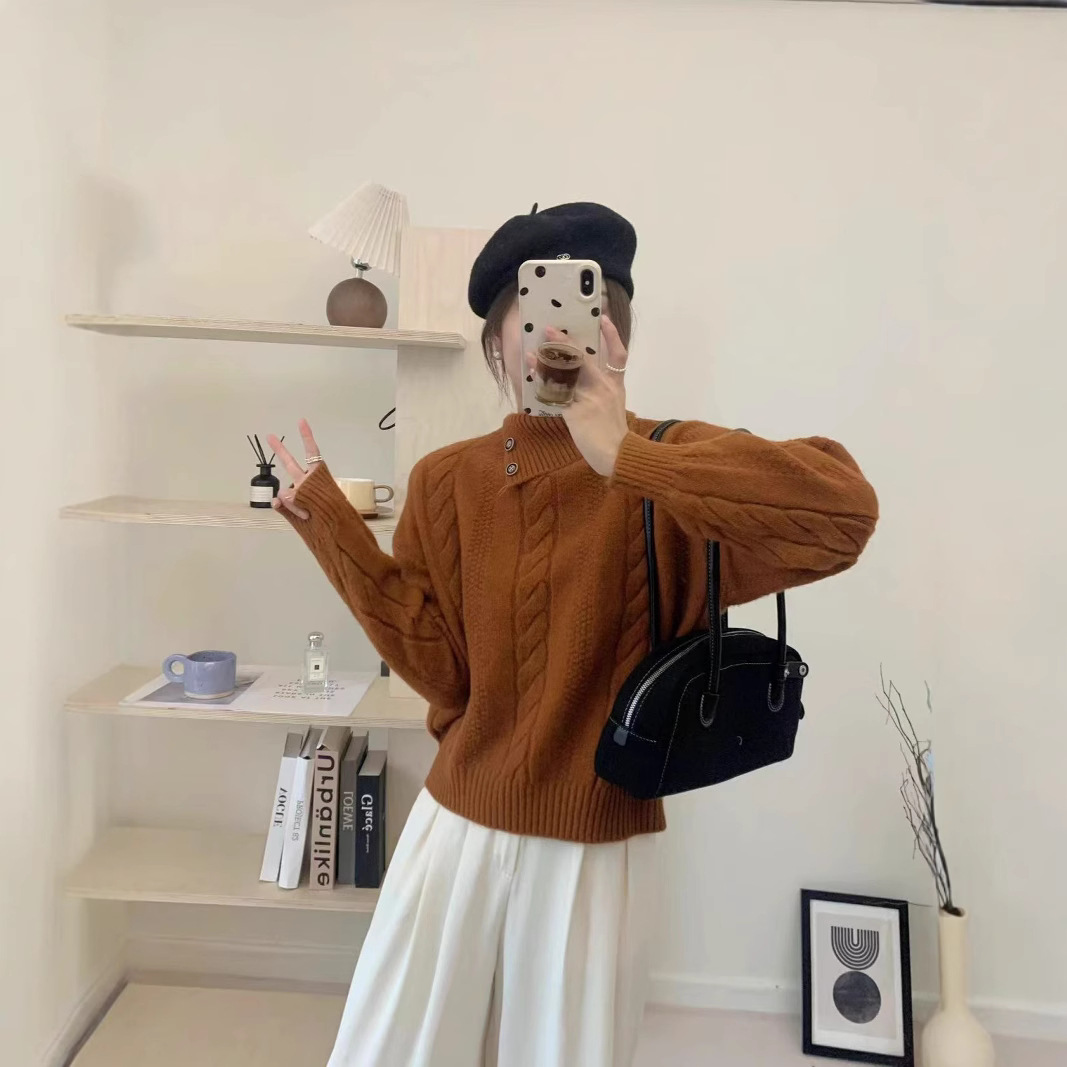 短いタイプの不規則な襟元の麻の花のセーターの女性の2024秋冬の新型のゆったりした気質のニットの小さい背の上着